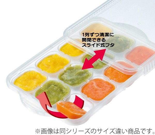 離乳食を小分けにして1枚にまとめて冷凍保存する事ができます。半円型なので取り出しやすく必要な分だけ使うことできます。スライド式のフタなので1列ずつの開閉ができてホコリが入りにくいです。トレー同士積み重ねができるので冷蔵庫内でスッキリ収納できます。同シリーズの別サイズトレーとの積み重ねも可能です。【商品詳細】 サイズ/約幅20.2×奥行14×高さ2.8cm 内容量/1個 材質/ポリプロピレン 生産国/日本製 型番/TRMR18 備考/※食洗機・冷凍・電子レンジOK(フタ部分は電子レンジ不可) ※耐熱温度140度、耐冷温度-20度 ※お客様のお使いのモニター設定、お部屋の照明等により色味が実際と異なる場合があります《ベビーフード 保存容器 手作り離乳食 手作り 離乳食 冷凍保存 容器 器 うつわ 入れ物 出産準備 赤ちゃん レンジ チン レンチン 食器洗い機 食洗機 電子レンジ 食洗機可 電子レンジ可 対応 OK 使える できる 可能 LH2755》