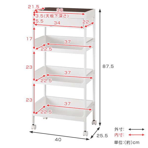 | 耐荷重 | 天板::約 0.5kg 天板棚板:約 1kg 引出し:約 1kg 棚板上段:約 2kg 棚板中段:約 3kg 棚板下段:約 3kg 合計:約 10.5kg |