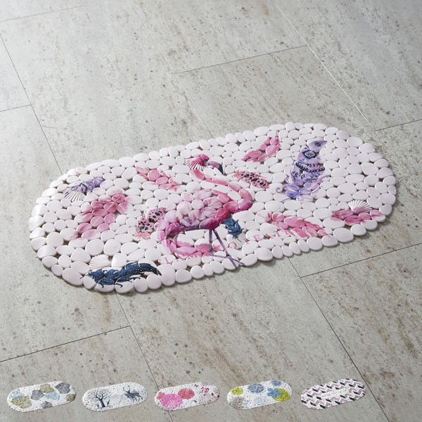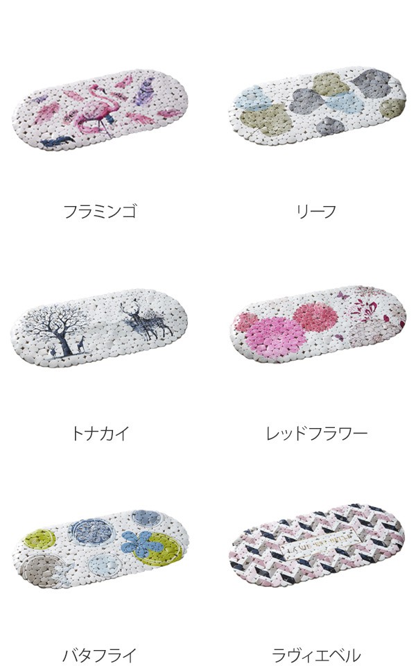 色鮮やかなデザインでご自宅のお風呂を華やかにしてくれるバスタブマットです。浴槽に敷くことで浴槽に入る時や、浴槽から立ち上がる時に足を滑らせることを防ぎます。バスマットの表面は小石や貝殻を並べたような可愛いデザインです。また、デコボコした表面が足の裏に引っかかり滑り止めになります。足を滑らすと危険なご年配の方、妊婦の方、小さなお子様がいらっしゃるご家庭にもおすすめです。足元が寒くなる冬場の浴室に敷くのもおすすめです。 【商品詳細】 サイズ/W68×D33.5×H0.5cm 内容量/1枚 材質/PVC カラー/フラミンゴ、リーフ、トナカイ、レッドフラワー、バタフライ、ラヴィエベル 生産国/中国製 型番/EF-UB09A、EF-UB09B、EF-UB09C、EF-UB09D、EF-UB09E、EF-UB09F《転倒防止 滑り防止 浴室 子供 お年寄り 妊婦 石畳 貝殻 吸盤 ラバー素材 バスルーム バス用品 バスグッズ 風呂グッズ》