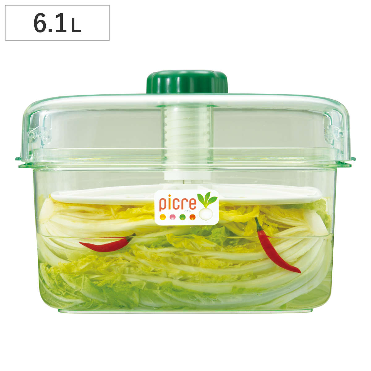 手軽に漬けられて、すぐに食べられるフタをするだけで押しができ簡単に漬物が作れる、即席つけもの器・6.1Lサイズです。重石を用意する必要がなく手軽に漬物が漬けられます。冷蔵庫の入れやすいコンパクトなサイズなので、省スペースにすっきり収まります。