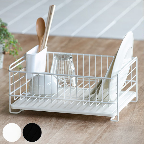 シンプルな角型フォルムの水切りバスケットすとんとしたシンプルでかわいい角型フォルムが特徴的な水切りバスケットです。仕切りやスタンドがないシンプルなスチールフレームなのでお皿の形を選ばず、夕食で使った食器類やカトラリーまで効率的に片付けられます。また、場所を取るフライパンやお鍋なども置きやすく、使い勝手も抜群です。