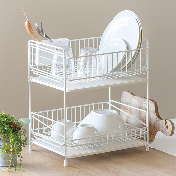 限られたスペースを機能的に使える2段タイプA4サイズの長辺に3〜4cmほどプラスした程度のスペースに、様々なカタチの食器やカトラリーまでまとめて置けます。また、シンプルに見えて実は隅々まで有効活用できる設計や、大きなプレートを立て掛けても倒れにくい安定感に、日本デザインならではの品質の高さを感じさせます。