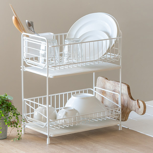 シンプルな角型フォルムの水切りバスケットすとんとしたシンプルでかわいい角型のフォルムが特徴的な水切りバスケットです。仕切りやスタンドなどない、シンプルなスチールフレームだからお皿の形を選ばず、家族の夕食分の食器類やカトラリーまで効率的に片付けられます。また、場所をとるフライパンや鍋なども置きやすく、使い勝手が良いです。