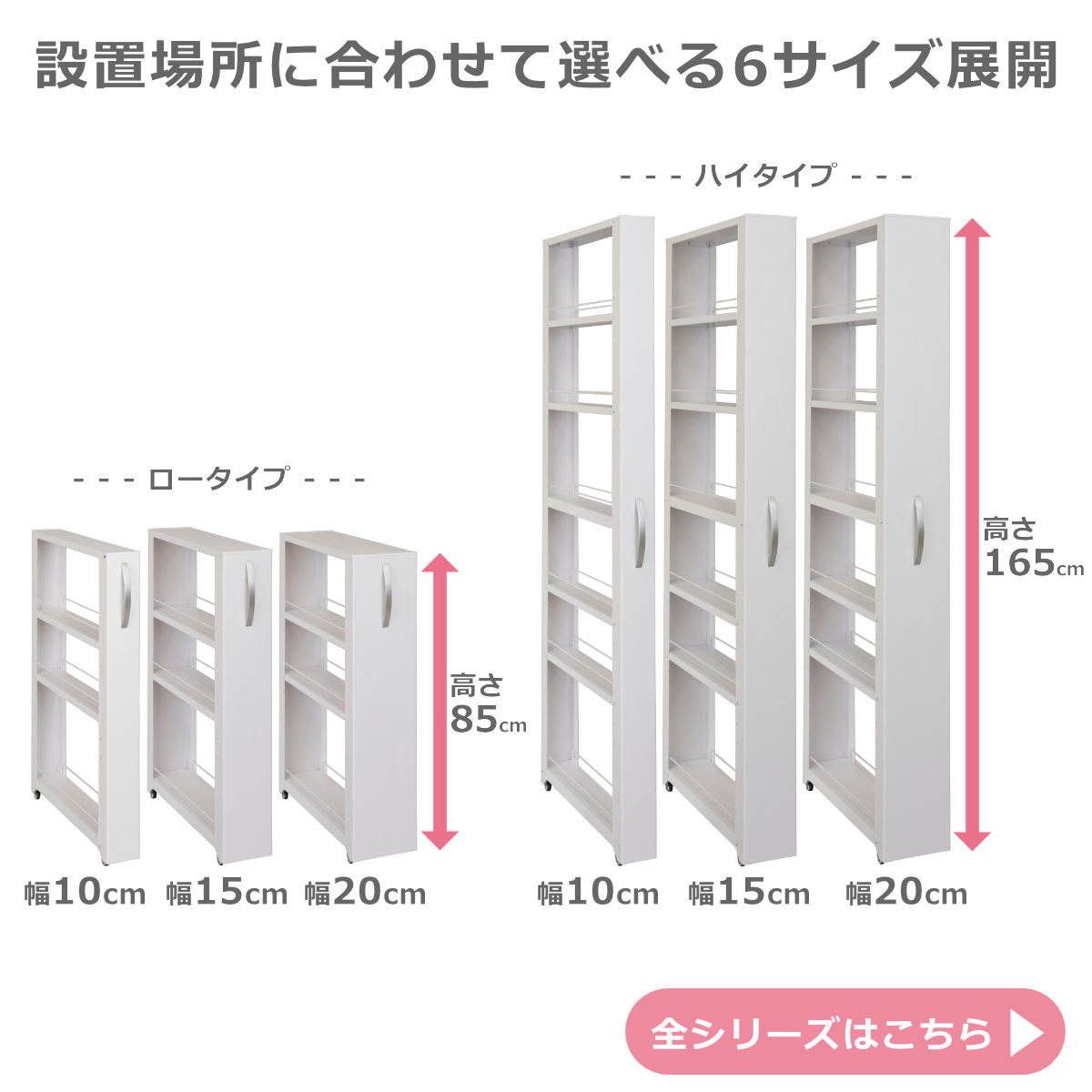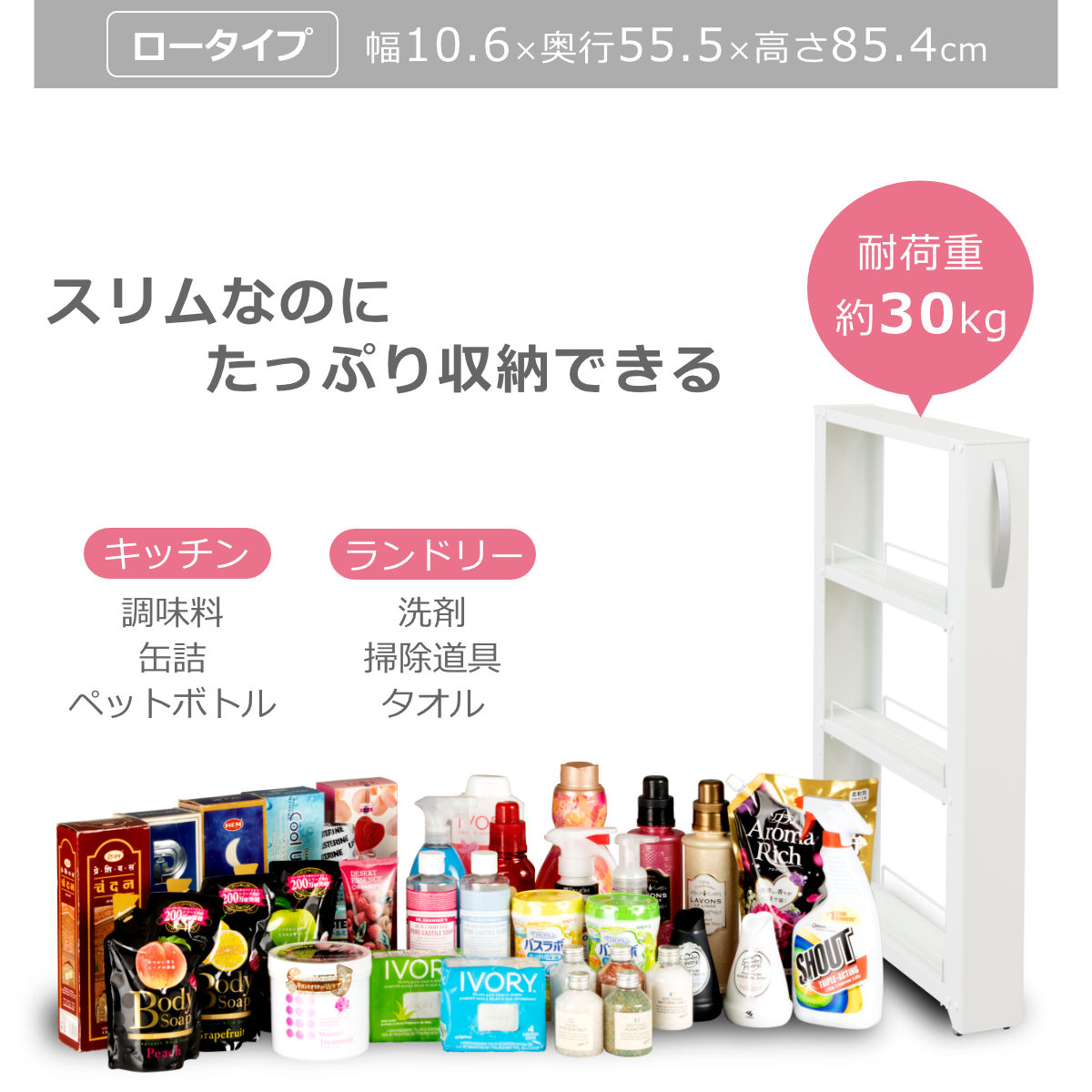 ▼クリックして動画をご覧ください▼幅たった10cm!台所や洗面所のわずかな隙間が収納場所に●キッチンや洗面所のちょっとした隙間を収納スペースとして有効活用できるトールワゴンです。