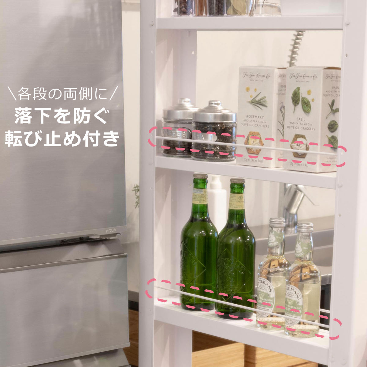 隙間から出す時に収納している物が落下するのを防ぐために、各段の両側には転び止めのバーが付いています。