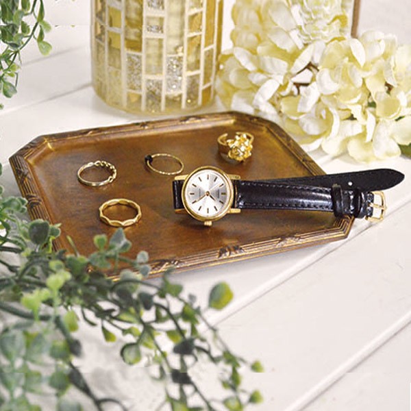 重厚感のあるレジン製のトレイアンティーク加工で重厚感のあるレジン製のトレイです。指輪や時計などのアクセサリーや小物、ハンコ置きとして使用できます。オシャレな空間が広がります。