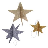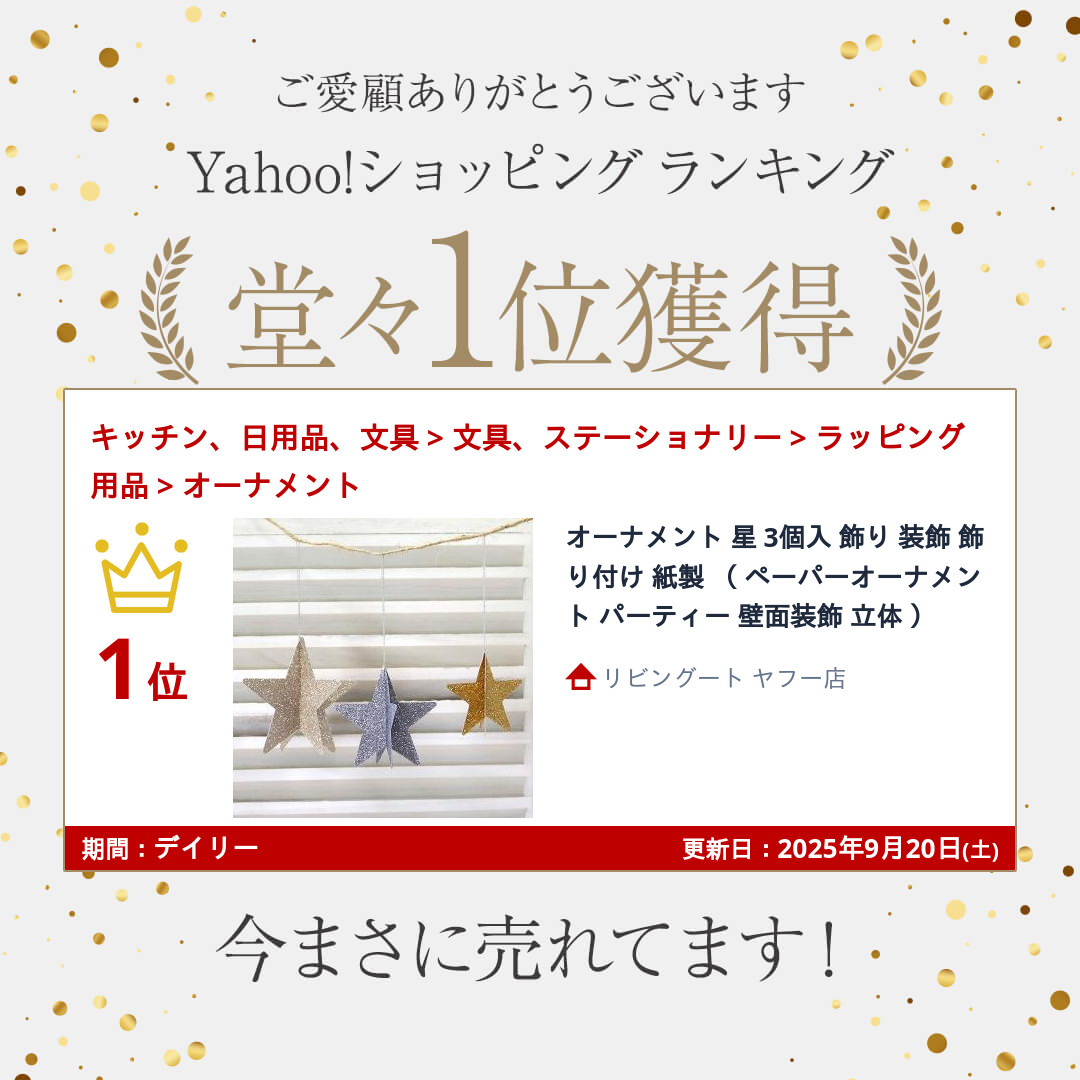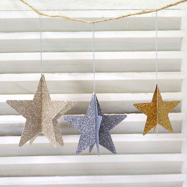 星の形をした立体オーナメントです。星の中心を折り曲げると立体になります。キラキラとしたラメ付きです。パーティーや女子会、結婚式などイベントでの飾りつけにオススメです。好きな場所に吊るしたり置いて飾れます。自由に組み合わせ出来ます。※表面をこするとラメの粉が落ちる場合があります。【商品詳細】 サイズ/大:幅約10.5×高さ約10.5cm、中:幅約8.5×高さ約8.5cm、小:幅約6.5×高さ約6.5cm 内容量/1セット 材質/紙 生産国/中国製 備考/※表面をこするとラメの粉が落ちる場合があります。 ※糸の長さに若干の個体差があります。 ※塗料特有のにおいがすることがあります。《誕生日会 おしゃれ バースデー ホームパーティー パーティーグッズ お祝い イベント デコレーション デコグッズ 女子会 インテリア 写真 小道具 演出 男の子 女の子 サプライズ メモリアルバースデー バースディ クリスマス インスタ インスタ映え SNS 小物 撮影小物 ラメ ゴールド キラキラ グリッター ウォールデコ 壁 DIY スター LH4198》