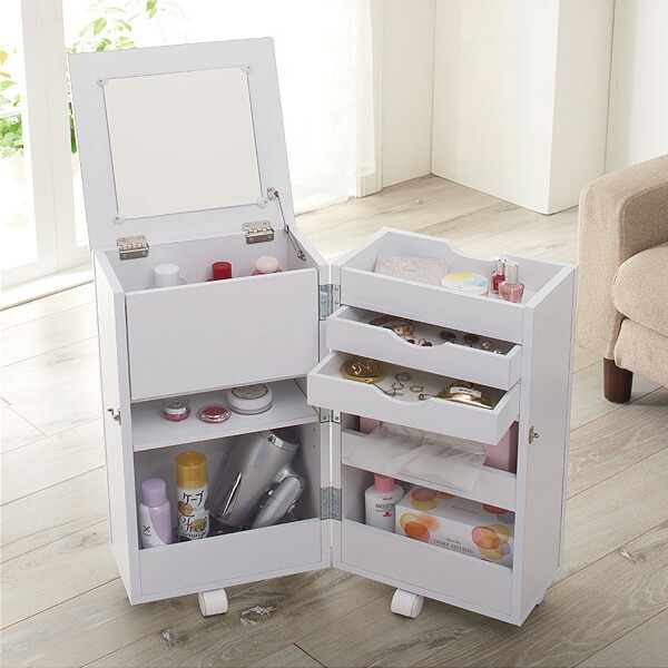 収納時は幅約32cmのスリムなワゴンは、省スペースな設置が可能です。キャスター付きなので、女性の方でも移動が楽々でお掃除の時に大変便利です。シンプルデザインなのでお部屋の景観を損ねる事なく置く事ができ、ソファーの横に置いてサイドテーブルとして使用する事もできます。左側上部は、高さ約19cmまでのスプレー缶やボトル類などを収納する事ができ、左側上部の仕切り板は折りたたみ式で仕切り板を出した状態だとコスメの仮置きが可能です。フェルトを敷い…【商品詳細】 サイズ/約幅32×奥行30×高さ63.5cm 重量/約11kg 内容量/1台 材質/合成樹脂化粧合板(PVC張り) 生産国/台湾製 型番/LT-140 WH 備考/※完成品 ※キャスター2箇所ストッパー付き ※棚板は3cmピッチ、3段階で取り付け可能です。《送料無料 鏡付き メイク 化粧 引き出し メイク台 鏡台 ホワイト かがみ 引出 コスメ収納 メイク収納 化粧収納 小物収納 メイクアップ ネイル ピアス イヤリング シンプル ナチュラル リビング 寝室 玄関 部屋 デスク テーブル 白 幅 奥行き 20 高さ 65 センチ プレゼント ギフト 母の日 贈り物 ティッシュボックス 天板 LH115》
