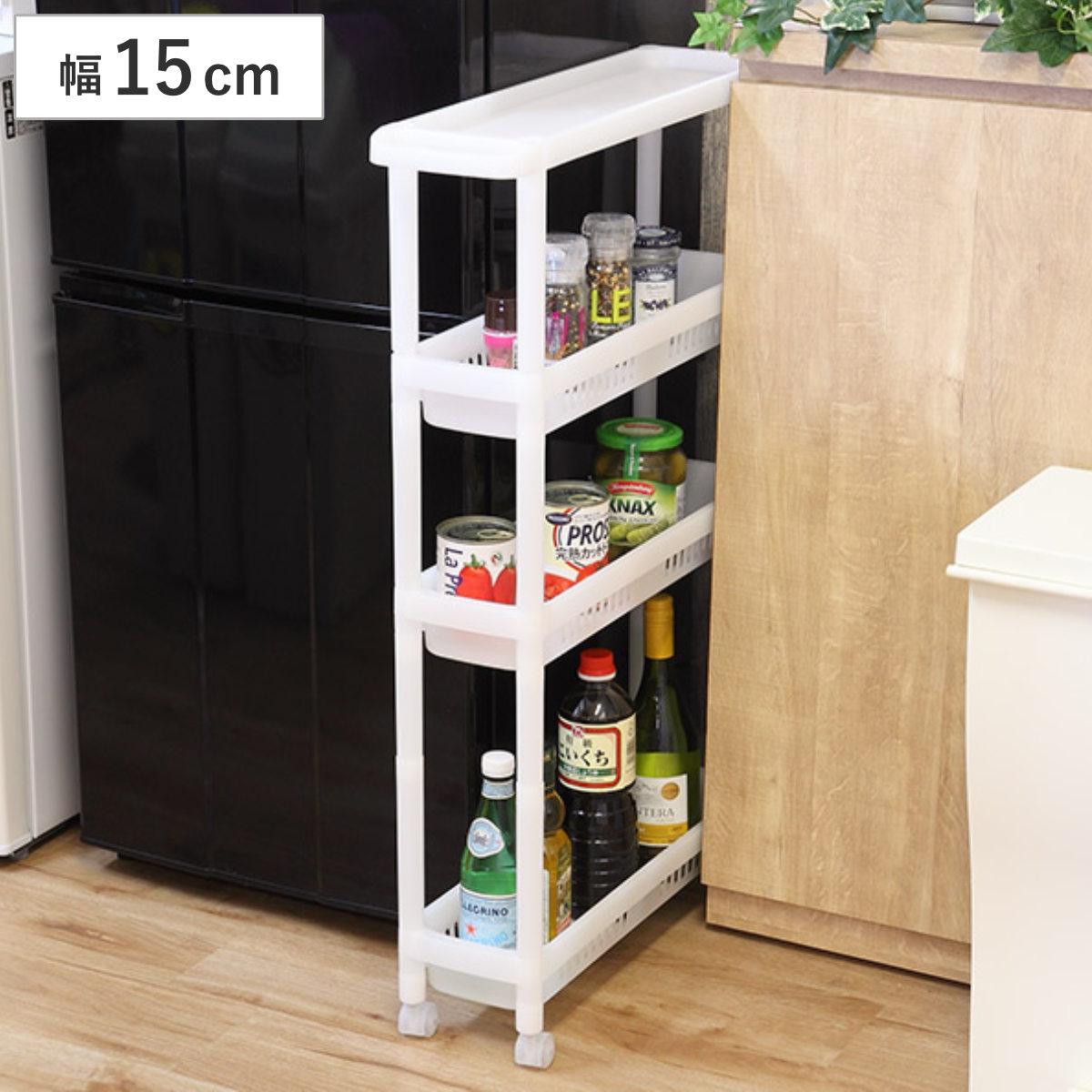 ●幅15cmのデッドスペースを有効活用できるスリムキッチンワゴンです。