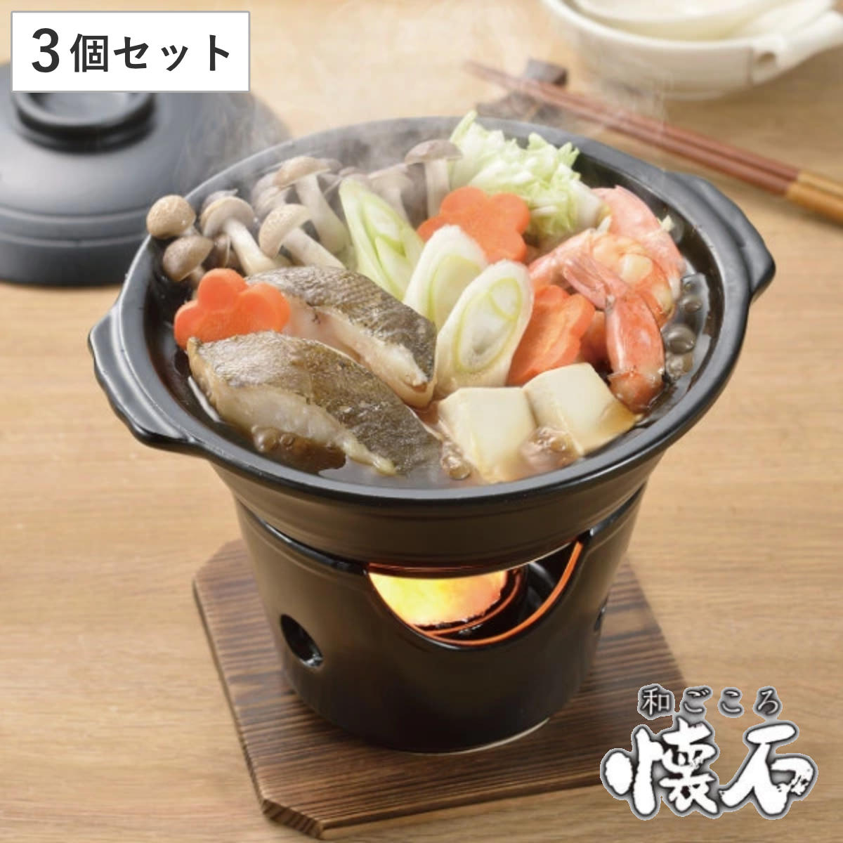 出来たて料理を卓上でご家庭で本格料亭気分が味わえる「和ごころ懐石シリーズ」の寄せ鍋コンロ付きセットです。陶器ならではの味わい、温かみのある風合いで料理の美味しさが引き立ちます。コンロと木台が付いているので、手軽に1人鍋がお楽しみ頂けます。こちらは3個セットなので、ご家族でのご使用もおすすめです。