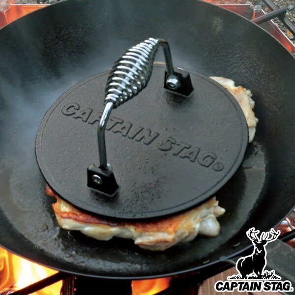 美味しさのしるしでもあるグリルマーク(焼き目)をキレイに付けられます。お肉をプレスすることで熱が均一に通り、ムラなく焼き上げます。肉のソリを抑え、表面をパリッと仕上げます。ご家庭でもフライパンを使用して美味しく調理が出来ます。 【商品詳細】サイズ/約高さ8.5cm 直径:約17cm 重量/約1.2kg 内容量/1個 材質/本体:鋳鉄、ハンドル:鉄(焼付塗装) 《レジャー キャンプ アウトドア用品 レジャー用品 キャンプ用品 キッチンツール キッチン 調理 器具 調理道具 お料理 お肉 肉 イベント》
