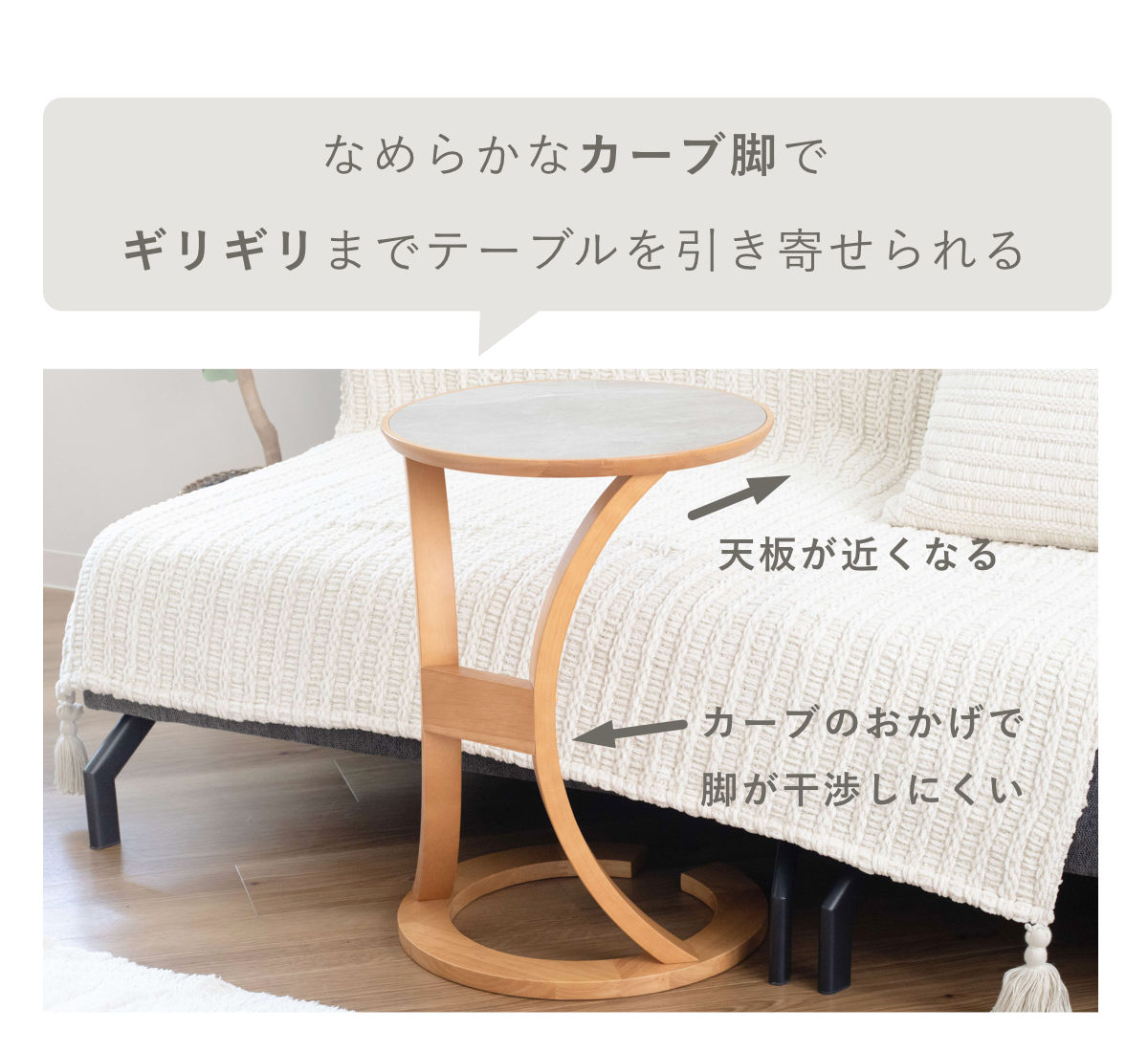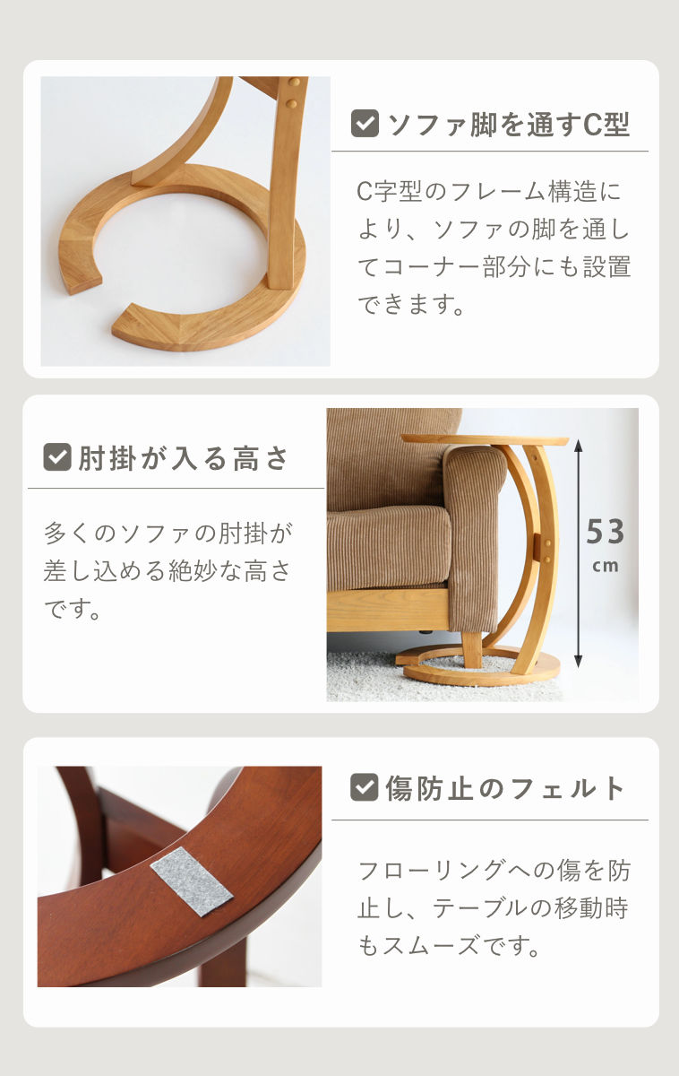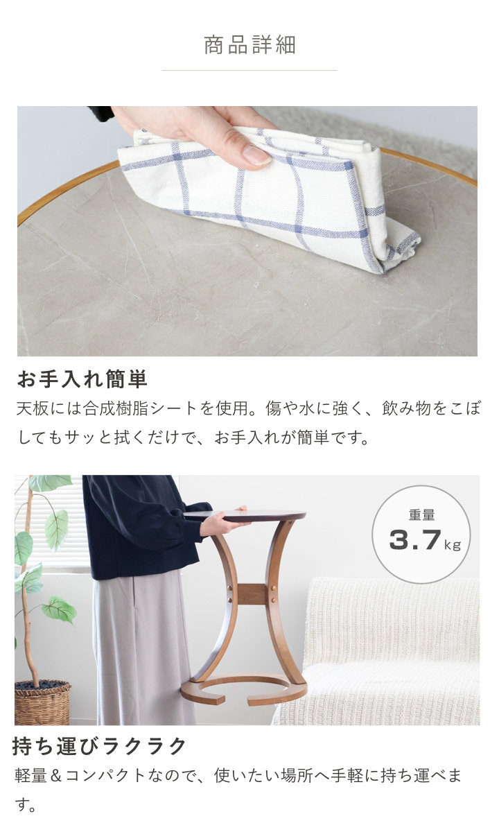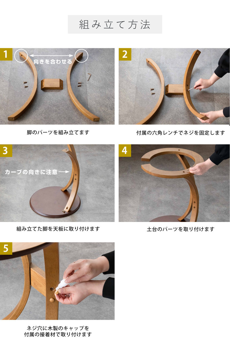 | 材質 | 本体:天然木化粧繊維板(オーク材) 脚:積層合板(ラバーウッド突板) ベース:天然木(ラバーウッド材) 脚の桟:天然木(ラバーウッド材) |