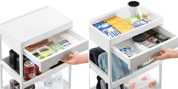 引き出しには小物を収納引き出し付きなので、キッチンではお弁当グッズや輪ゴム、リビングでリモコンやボールペンなどの文房具、ランドリーではメイク用品や綿棒など、ごちゃつきやすい小物類の収納に最適です。