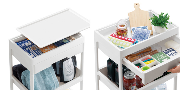 トレーになる天板と目隠しできる天板下収納天板は取り外しができてトレーにもなるので、調理中の作業スペースやお料理の一時置きとして使用した後そのまま出来上がったお料理を食卓へ運ぶことができます。また、天板下にも収納スペースがあり、生活感を見せたくない小物類などを目隠しできます。トレーを外した状態でもお使いいただけます。