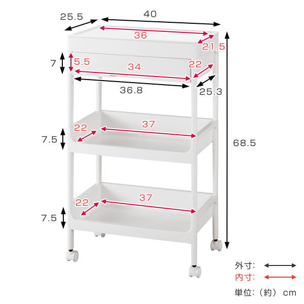 | 耐荷重 | 天板:約 0.5kg 天板棚板:約 1kg 引き出し:約 1kg 棚板(上段):約 3kg 棚板(下段):約 3kg |