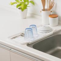 シンクに直接水が流れる水切りトレーキッチンに圧迫感なく置ける水切りトレーは、水切りカゴのように大きなモノは置きたくない方や、食洗機があるのでちょっと洗い用にコンパクトな水切りが欲しい方におすすめです。よく使うコップやカトラリー、茶碗やお皿、食洗機に入りきらなかった少量の洗い物などにサッと出して手軽に使えるので便利です。食器から落ちた水は直接シンクに流れるようになっているので、排水の手間がかかりません。トレーの排水口が広く、水がトレー内に溜まらずすっきり水切りができるので、いつでも清潔にお使いいただけます。