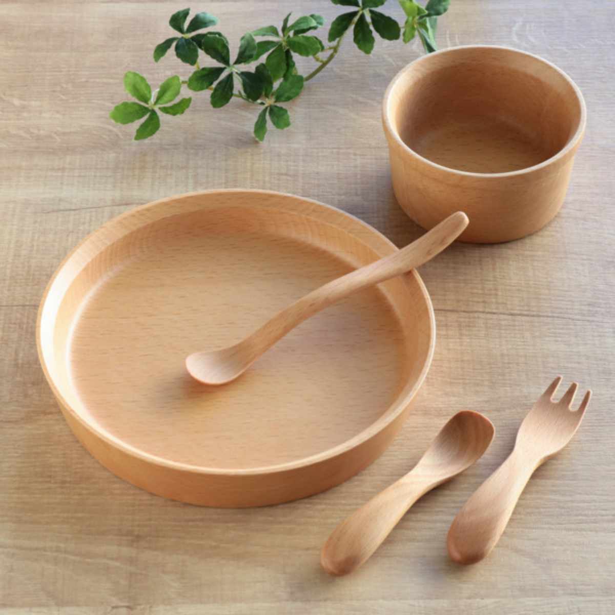 成長に合わせて長く使える 天然木食器5点セット便利で程よいサイズのお皿とボウル、成長に合わせて使えるカトラリーの5点セットです。離乳食から幼児食へと幅広く、お子さまの成長に合わせてお使い頂けます。