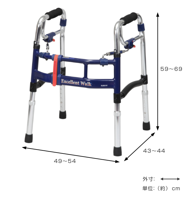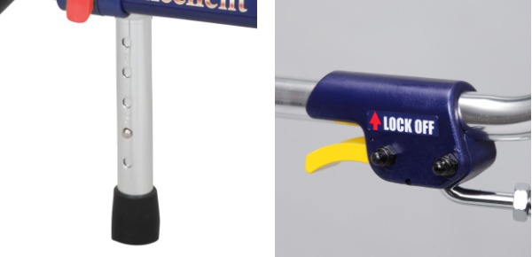 | 高さ調節が可能 体型に応じて5段階の高さ調節が可能です。歩行器の高さは、普通に立っている状態で軽く肘が曲がり、少し前傾姿勢になるくらいが最適といわれています。 | 折りたたみレバー 黄色のレバーを握るとコンパクトに折りたたむことができます。2.8kgと軽量のため女性でも楽に持ち運べます。車のトランクや電車などに持ち込むのに便利です。 |