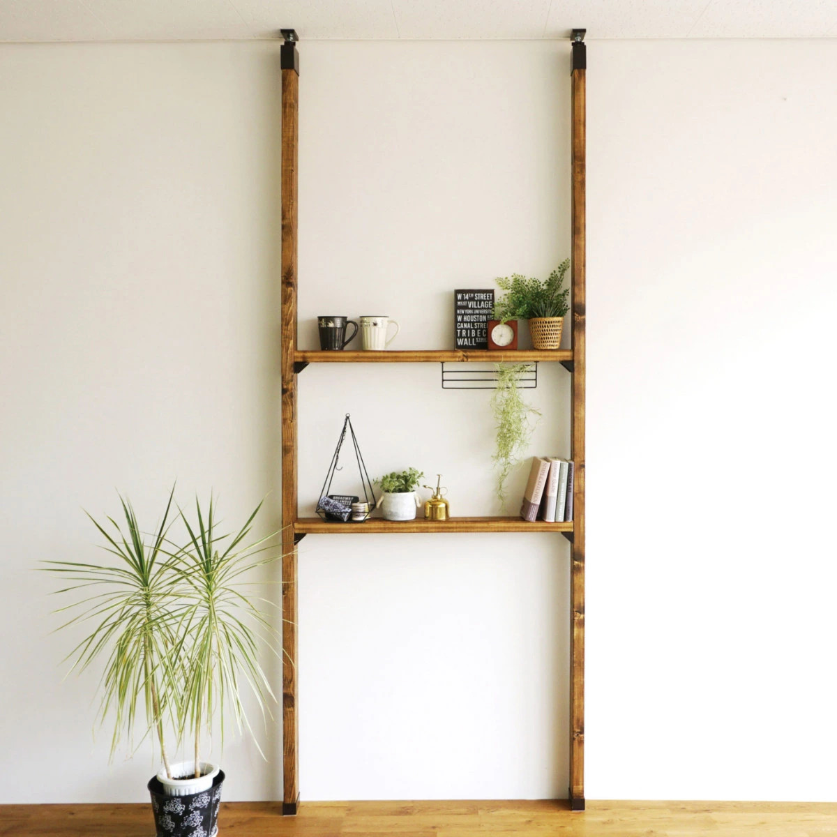 【使用荷重】棚板に2×4材を使用する場合、棚板1枚当たりの使用荷重は30kg、棚板の長さは120cmまでとしてください。また、棚板を複数設置する場合、使用荷重の合計は120kgまで、段数は4段までとしてください。使用荷重には棚板の重量も含みます。※使用荷重は実験値です。設置場所や使用木材によって条件が変わる為、保証するものではありません。
