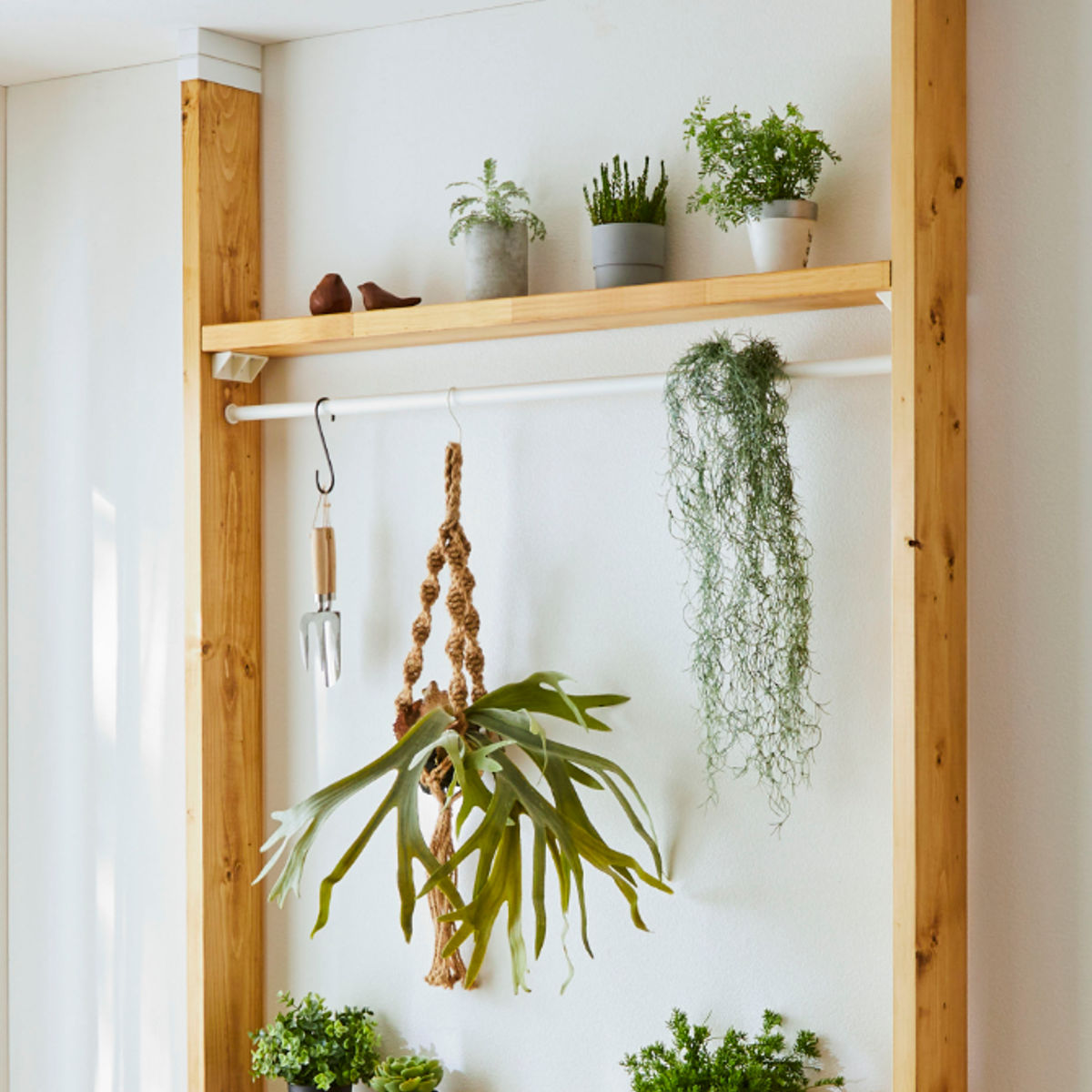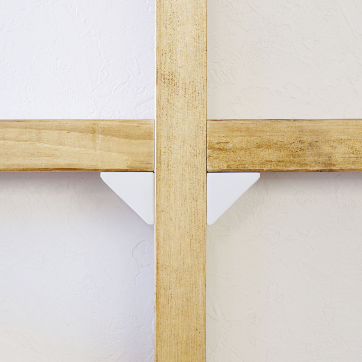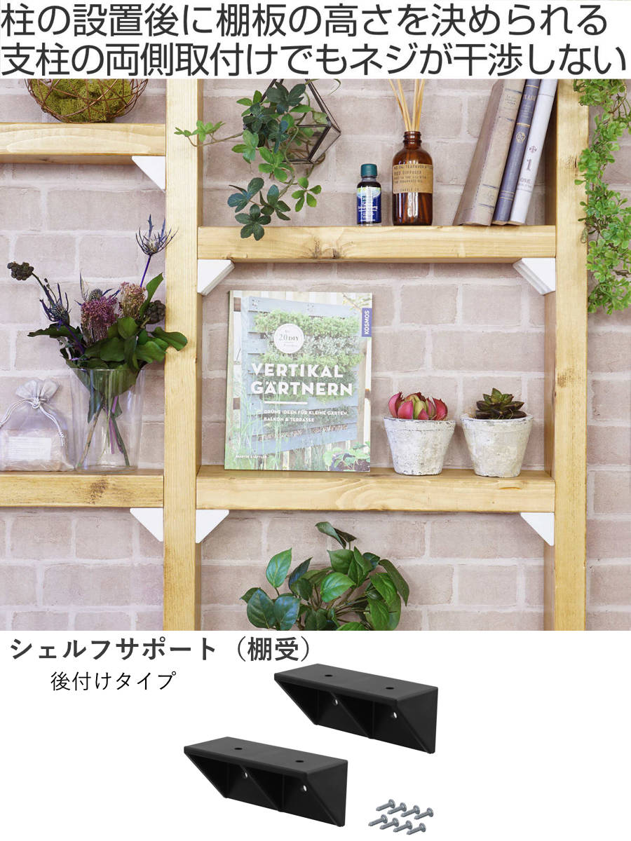 「シェルフサポート」2個入×5セット別売りのアジャスターを使って立てた1×4や2×4の柱に、棚を取り付けるための棚受けパーツです。後付けタイプの棚受けなので、柱をしっかり設置した後に、棚の高さを決められます。工具を揃えなくても、付属のネジとドライバー1本で気軽に組み立てられるので、「作りたい」を形にできます。