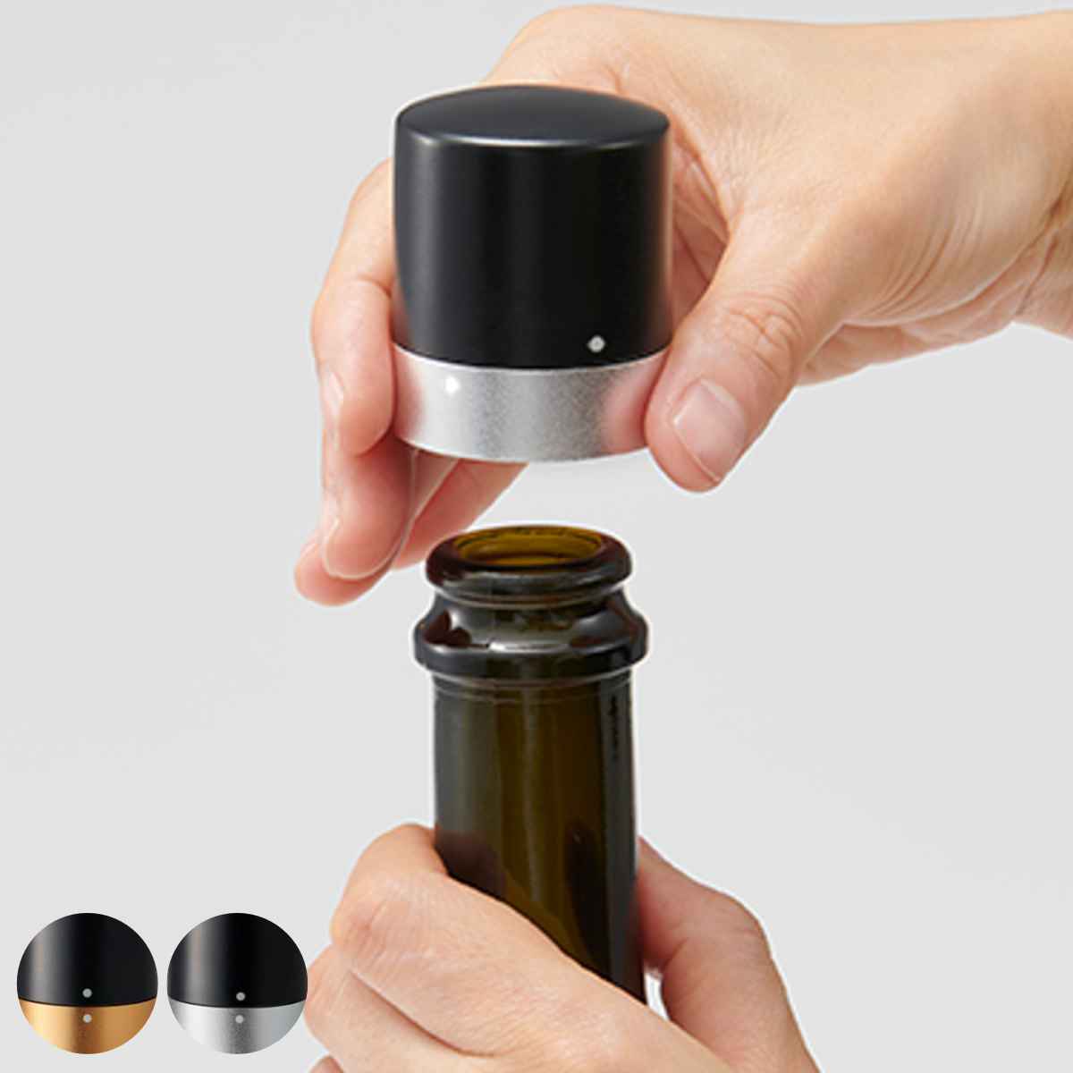 ![]() (1)製品側面の●印が離れてる状態でボトルに押し込んでください。 | ![]() (2)製品金属部分を持ち、黒いパーツをカチッと音がするまで時計回りに回すとロック。 | |
