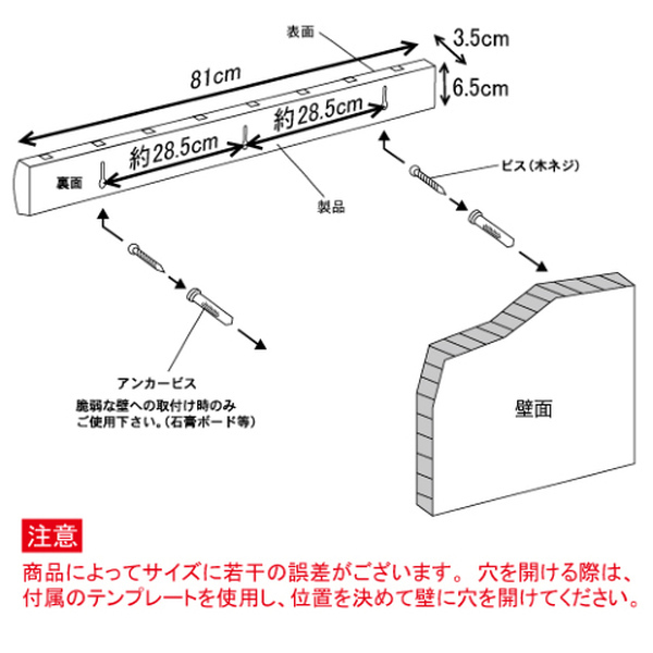 | 注意事項 | ※天然木を使用しているため、商品によって木目・色目等が異なる場合がございます。 ※設置する壁により電動ドリル等の工具が必要です。また、本製品は付属のネジがありますのでドライバーは必須となります。 |