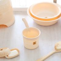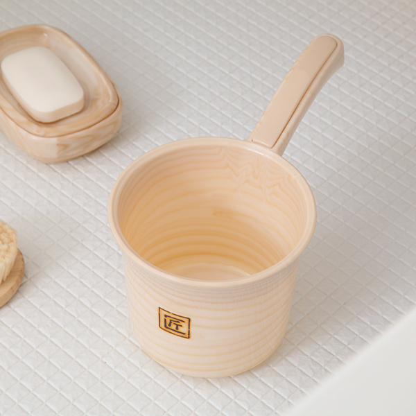 柔らかい色彩の木目調の模様が特徴的な手桶です。暖かみのある木目調は優しい雰囲気でどんなバスルームにもぴったりです。リアルな木目模様は表面だけの着色ではないので、消えたりめくれたりしにくいです。