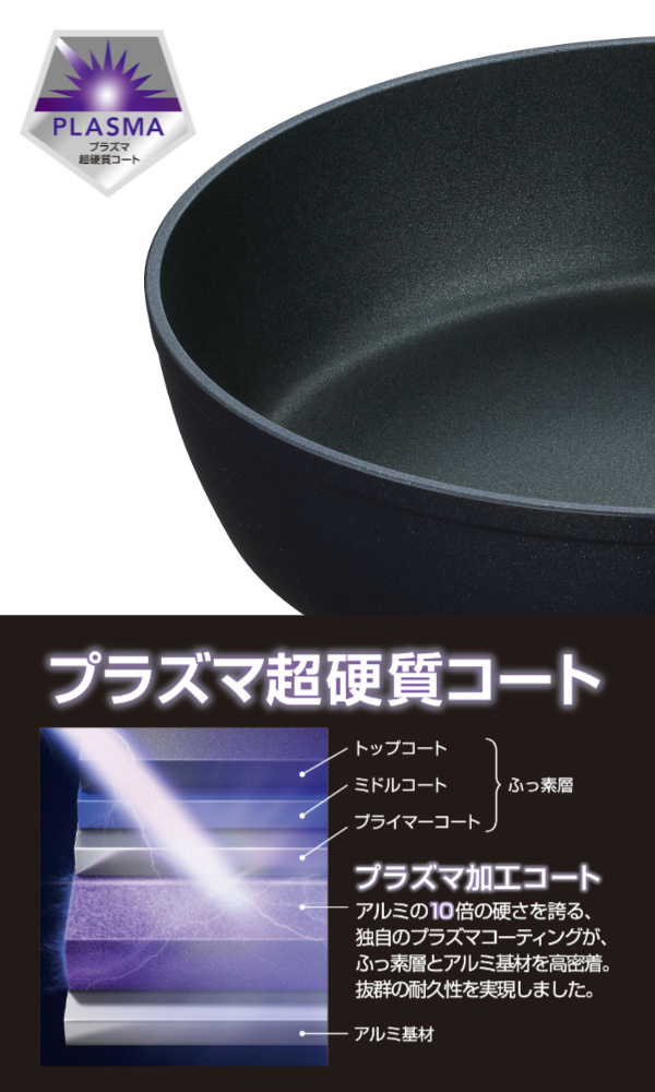 アルミの10倍の硬さを誇るプラズマ超硬質コート一般的な製法は、ふっ素層とアルミ基材で、長時間の使用でふっ素が剥がれやすくこびりつきやすいものでした。しかしプラズマ加工コートは、ふっ素層とアルミ基材に挟まれており、アルミの10倍の硬さがあり、長持ちします。複雑な凹凸の表面なので長時間の使用で表面のふっ素が剥がれても、プラズマ加工層が溝に入り込んだふっ素を守ります。