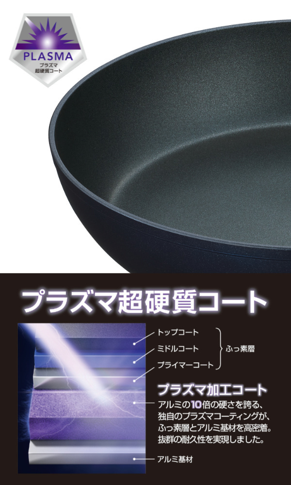 アルミの10倍の硬さを誇るプラズマ超硬質コート一般的な製法は、ふっ素層とアルミ基材で、長時間の使用でふっ素が剥がれやすくこびりつきやすいものでした。しかしプラズマ加工コートは、ふっ素層とアルミ基材に挟まれており、アルミの10倍の硬さがあり、長持ちします。複雑な凹凸の表面なので長時間の使用で表面のふっ素が剥がれても、プラズマ加工層が溝に入り込んだふっ素を守ります。