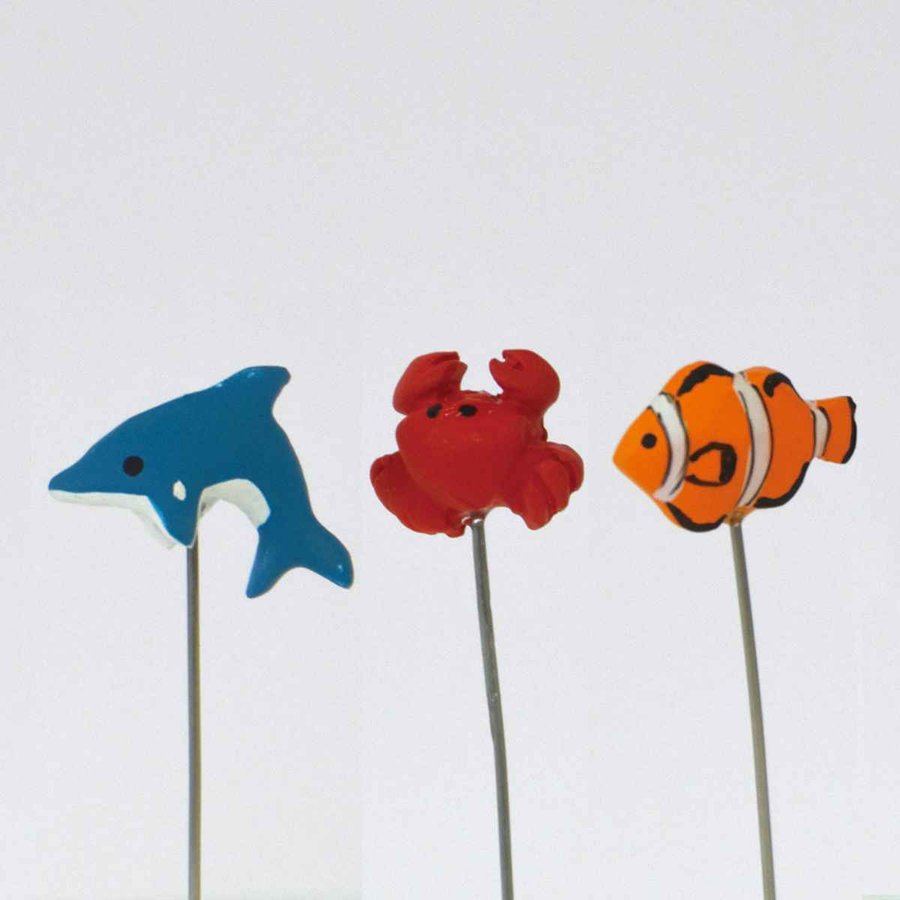 プランターに手軽にアクセントを付けられる●イルカ、カニ、クマノミのピックが1本ずつ入った、ミニピック3本セットです。
