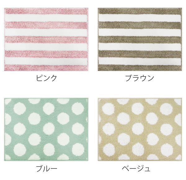 やわらかい肌ざわりが特長のバスマット 45×60cmやわらかい肌ざわりが特長。優しい色合い、デザインがかわいいボーダー柄とドット柄のバスマットです。