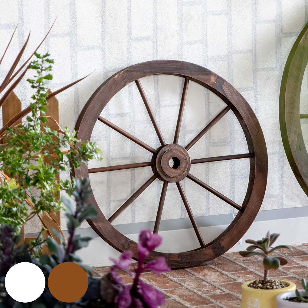 お庭をもっと素敵にコーディネート荷馬車の車輪をイメージした木のあたたかさを感じられるインテリアホイールはグリーンとの相性が抜群です。お庭や玄関先のインテリアとして立てかけておくだけで様になります。