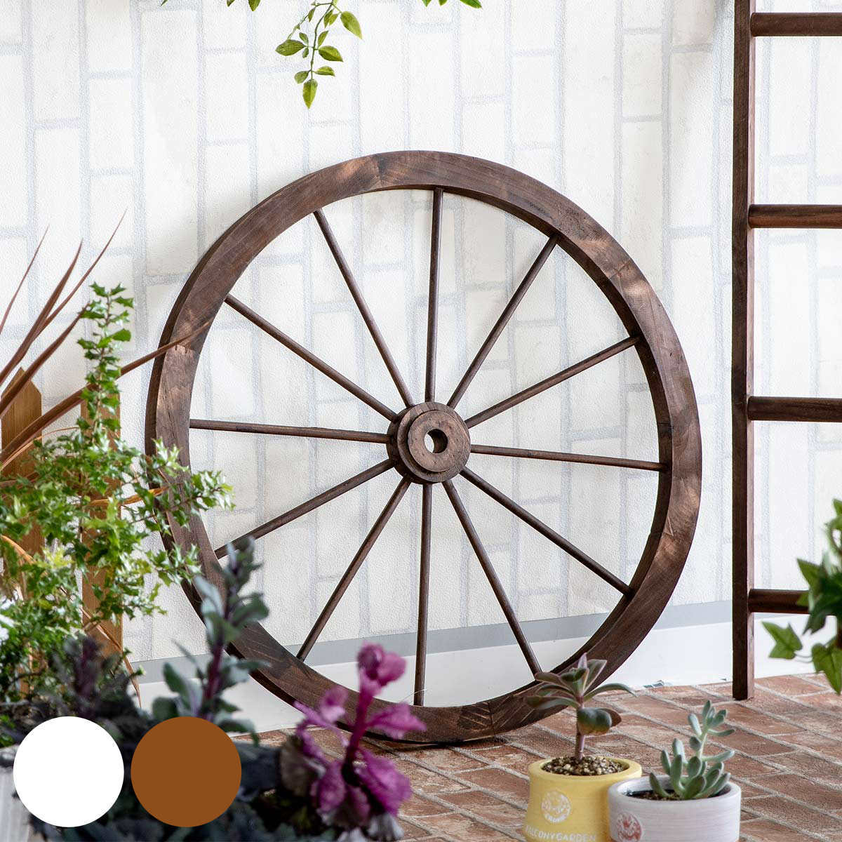 お庭をもっと素敵にコーディネート荷馬車の車輪をイメージした木のあたたかさを感じられるインテリアホイールはグリーンとの相性が抜群です。お庭や玄関先のインテリアとして立てかけておくだけで様になります。