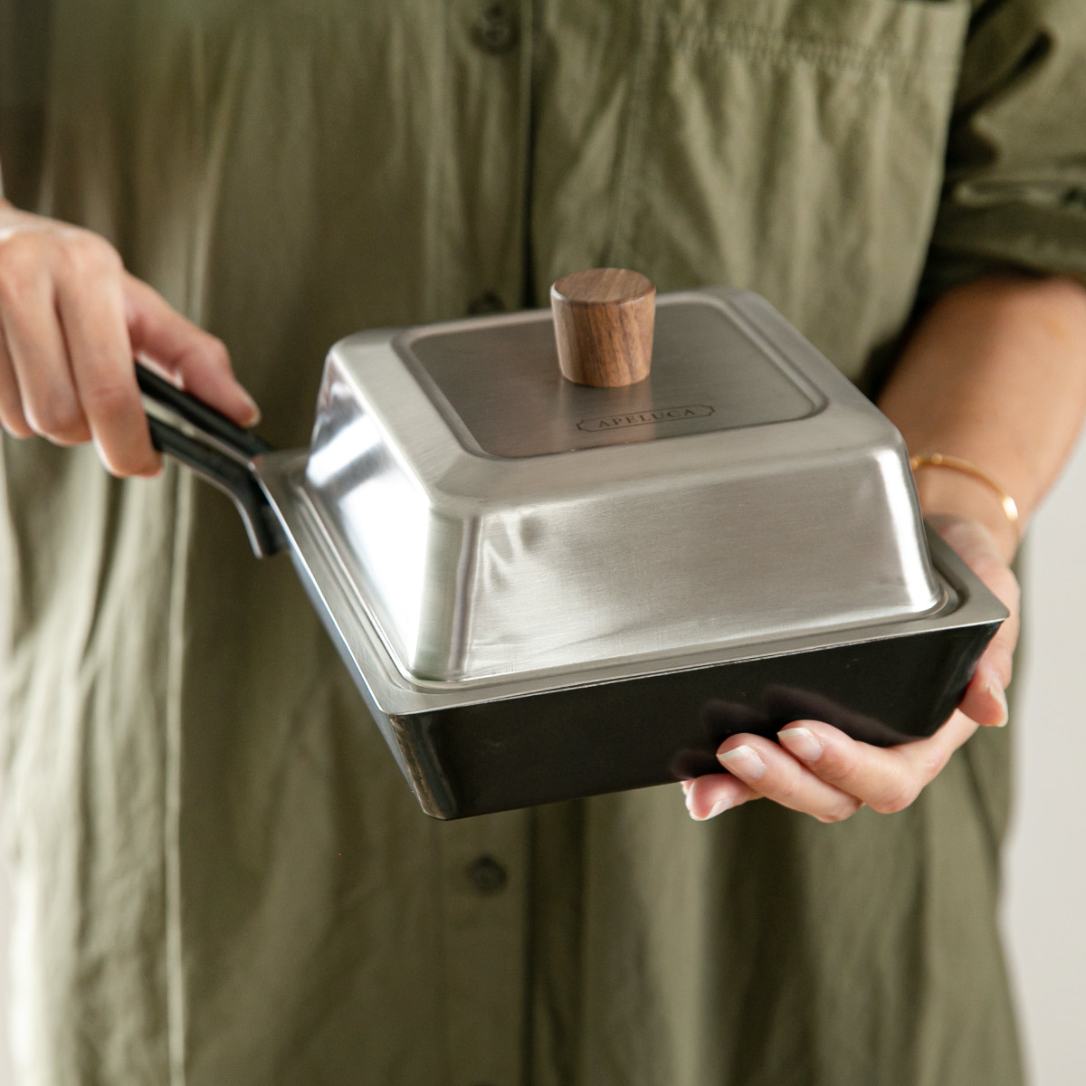 | 材質 | 本体:鉄(シリコン塗装)底厚3.2mm 蓋:ステンレス鋼(クロム18%、ニッケル8%) 蓋つまみ:ウォールナット(天然オイル塗り) |