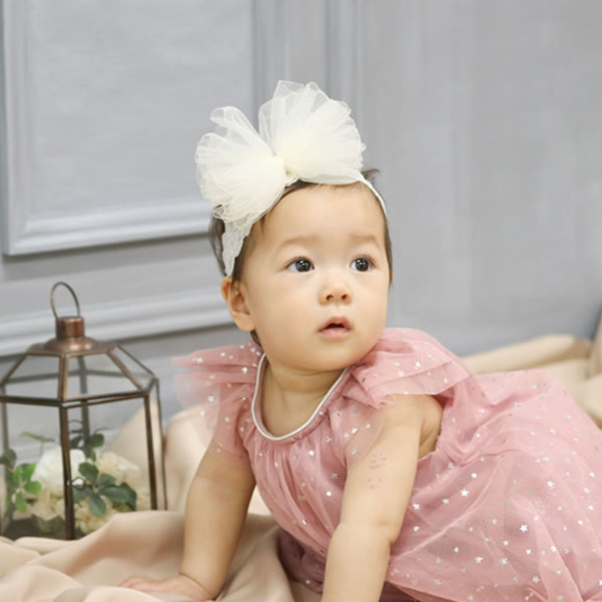 お出かけの際や記念日の写真撮影に真っ白でふわふわのチュール生地をふんだんに使用し、大きなリボンのヘアバンドに仕上げました。赤ちゃんのお誕生日や記念撮影などの特別な日の装いを華やかに彩ります。