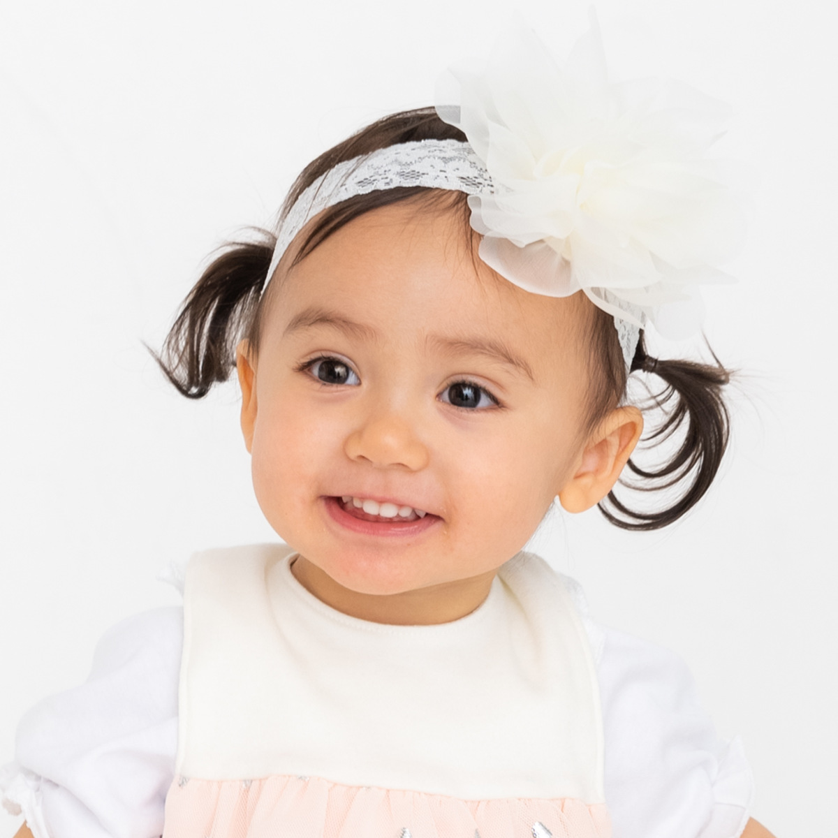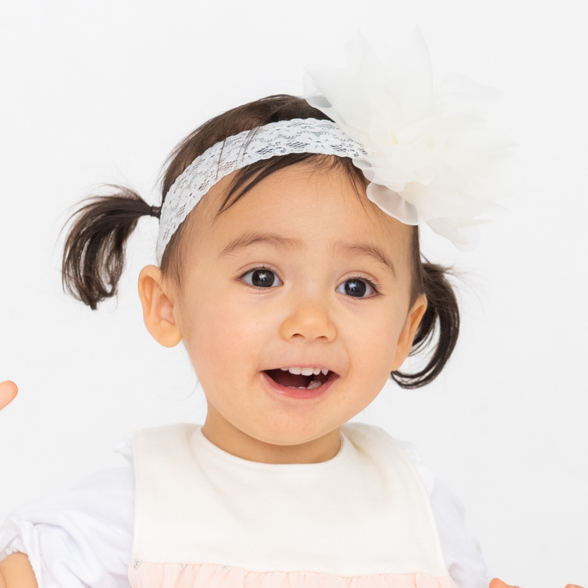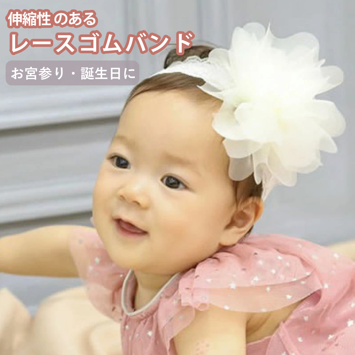 お出かけの際や記念日の写真撮影にぴったりボリュームたっぷりな存在感抜群のヘアバンドです。赤ちゃんのお誕生日や記念撮影などの特別な日の装いを華やかに彩ります。
