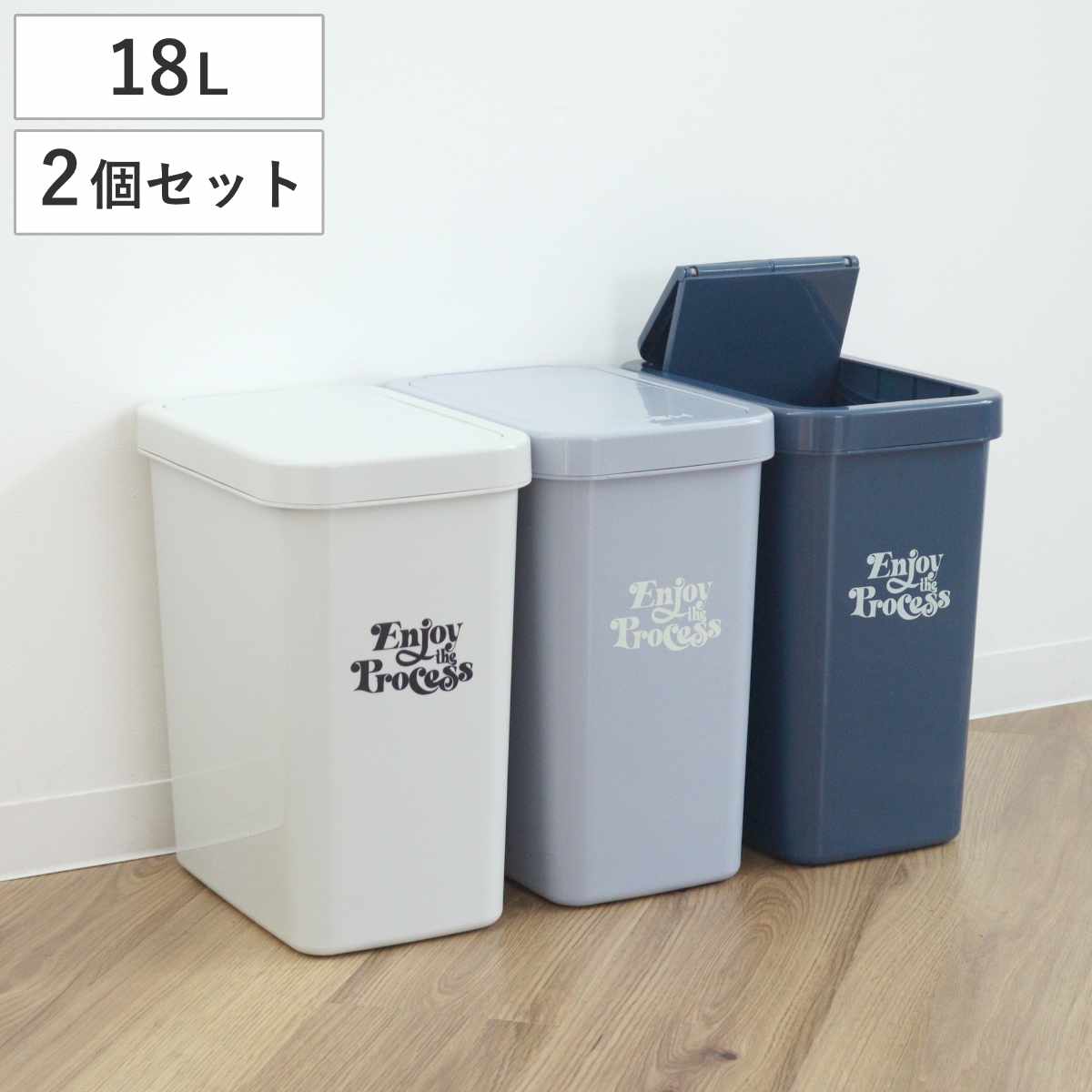 インテリアに馴染むスタイリッシュなゴミ箱 18L 同色2個セット英字ロゴがアクセントのスタイリッシュなゴミ箱です。表面はマットな質感で主張しすぎず、落ち着いた雰囲気です。
