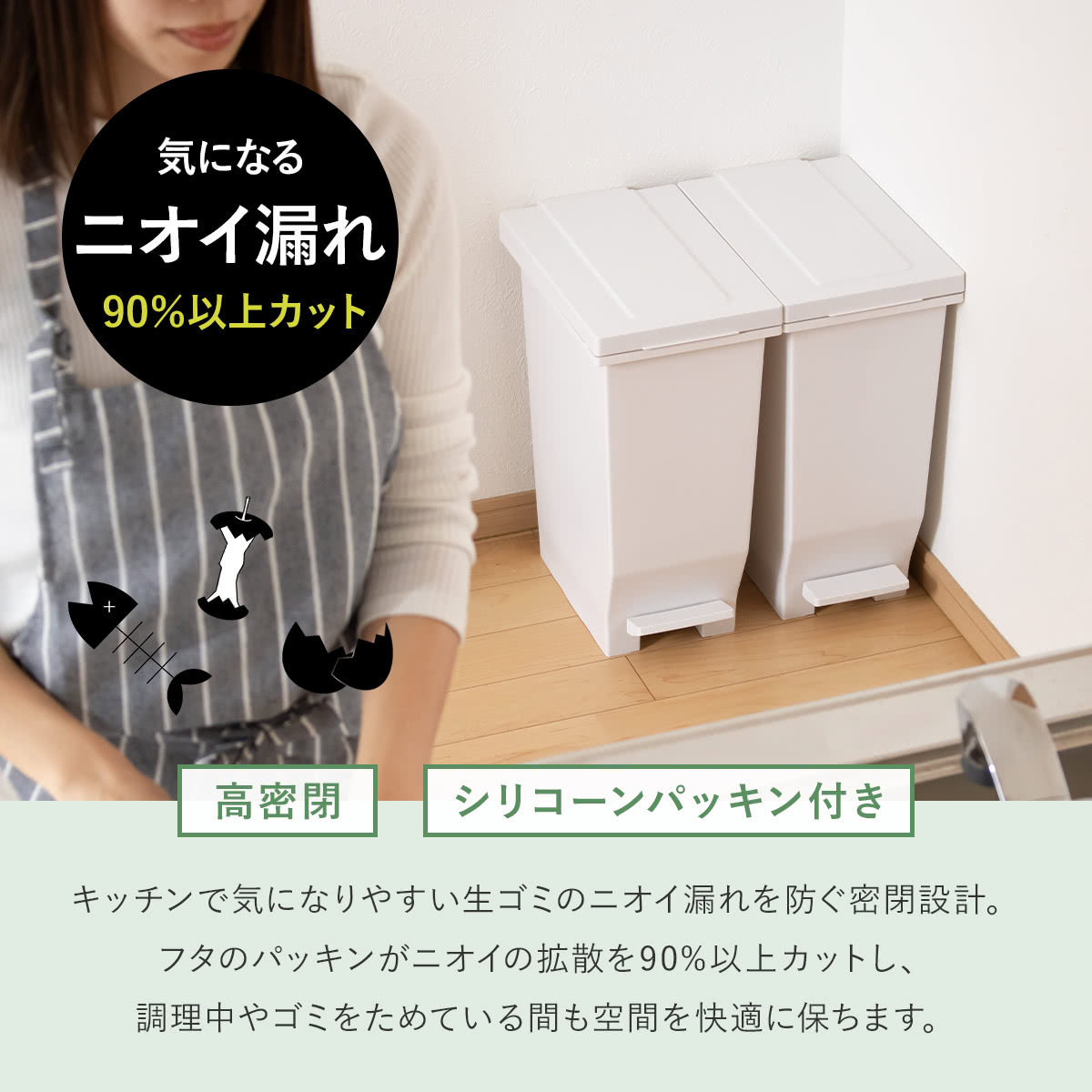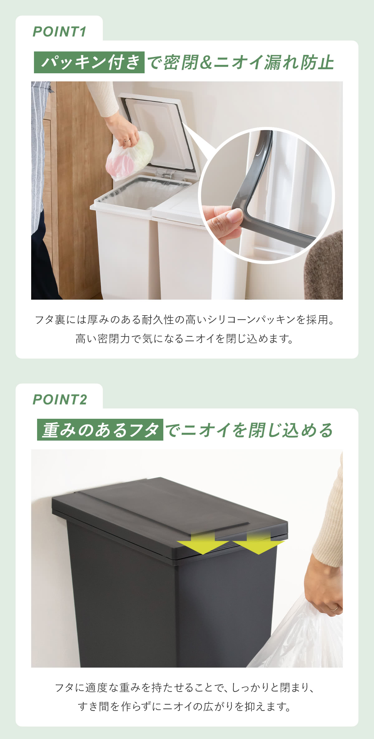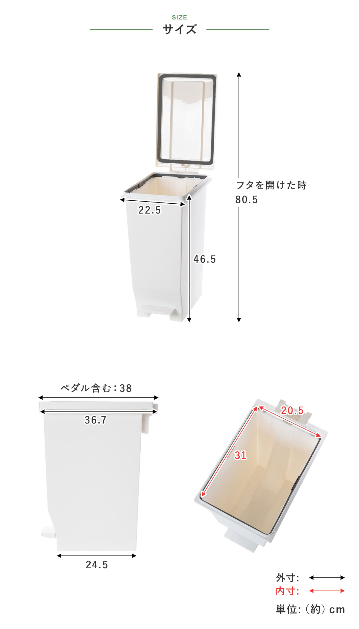 | 材質 | 本体・ふた・ポリ袋止め・ペダル:ポリプロピレン ペダルロッド:スチール パッキン:ポリエチレン |