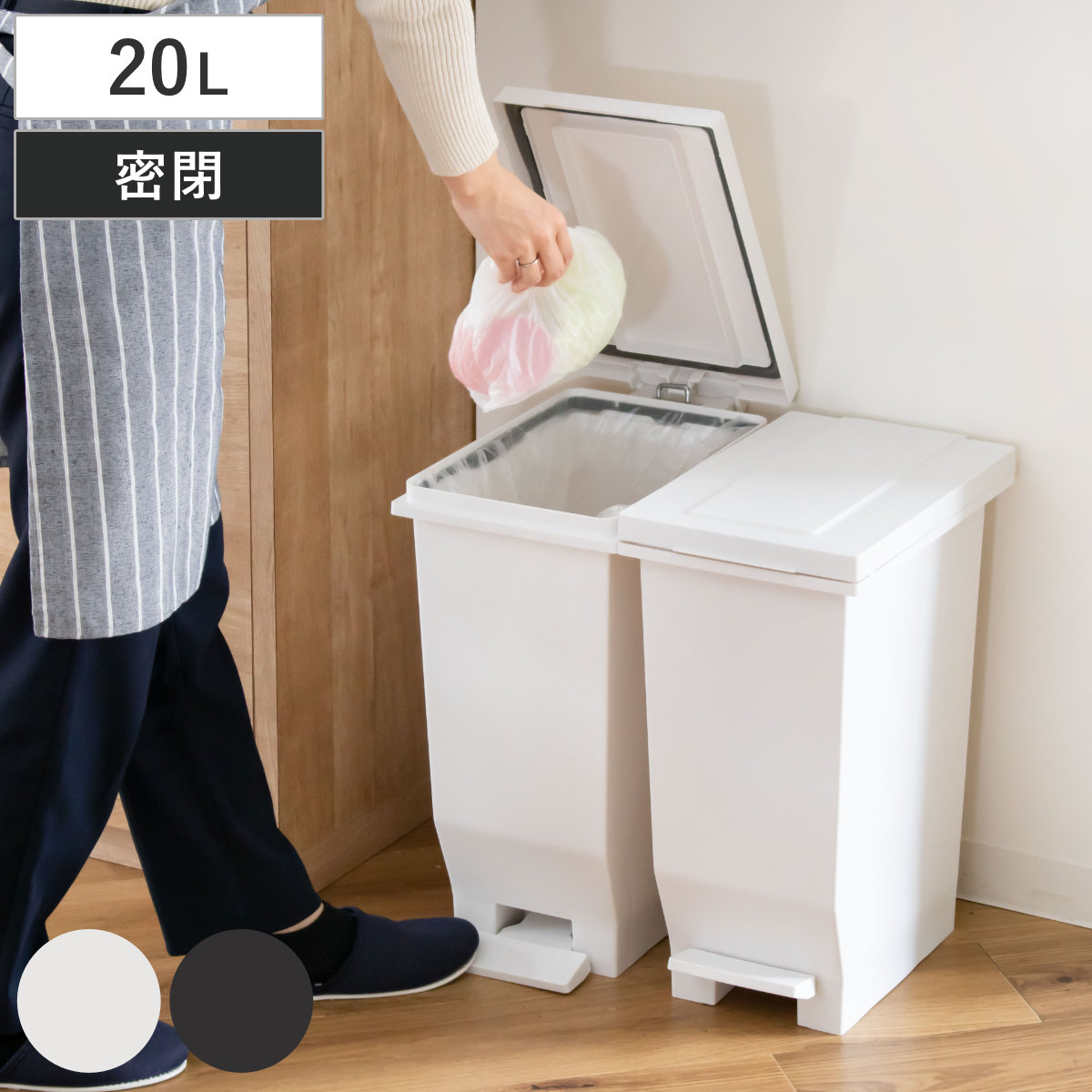 パッキン付きで高い密閉性、ペダル式ゴミ箱 20L同色2個セット通常のペダル式ゴミ箱で問題であったニオイ漏れを90%以上カットしました。ふた裏にパッキンが付いているため、隙間をつくらず高い密閉性があります。食品だけでなく赤ちゃんや介護のおむつ、犬猫用のペットシーツを捨てるのにも最適です。