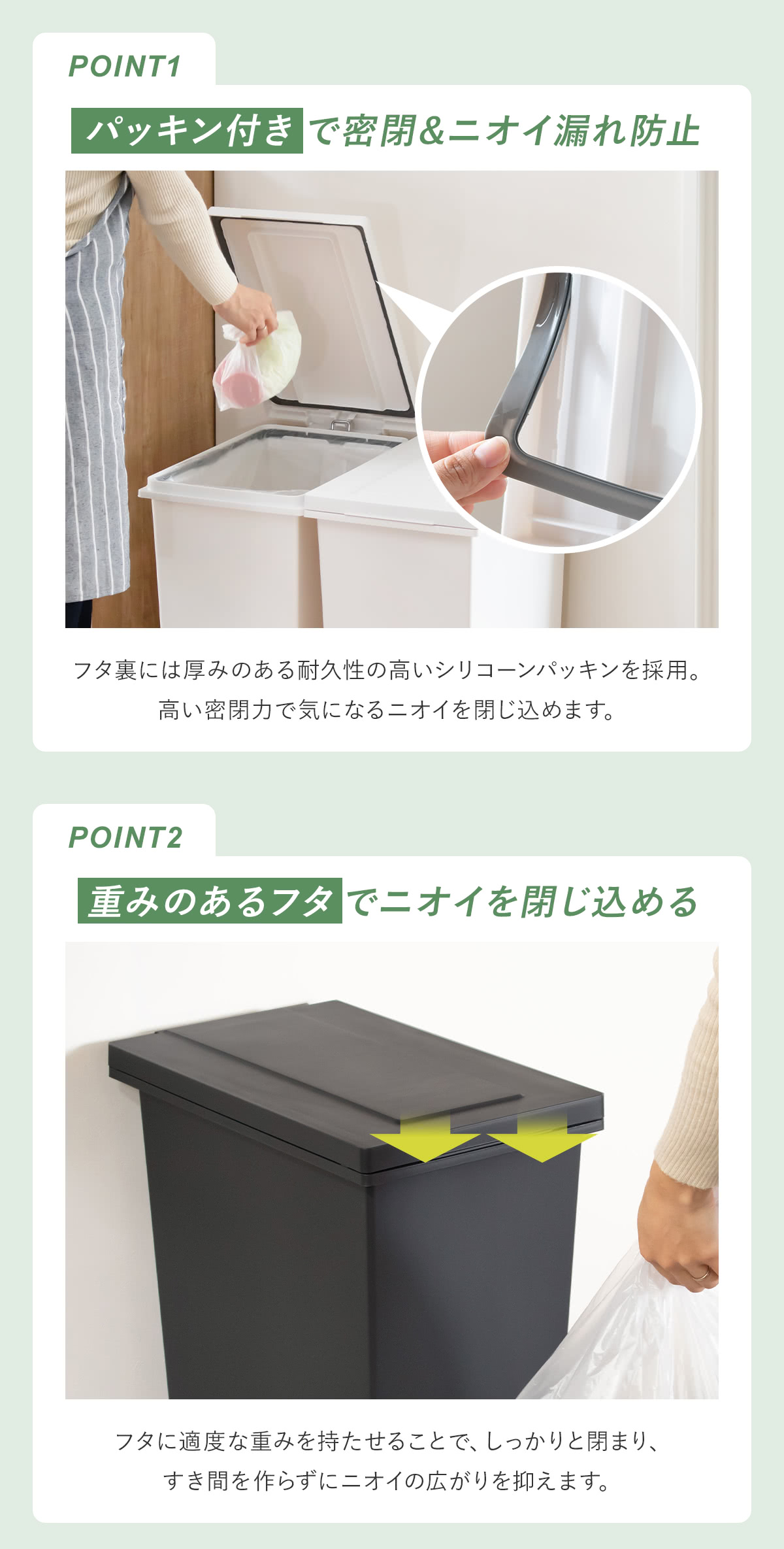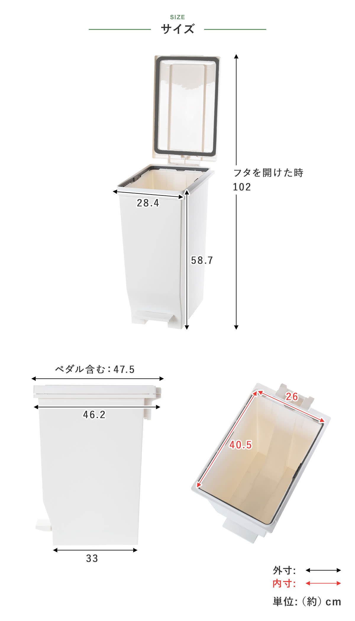 | 材質 | 本体・ふた・ポリ袋止め・ペダル:ポリプロピレン ペダルロッド:スチール パッキン:ポリエチレン |