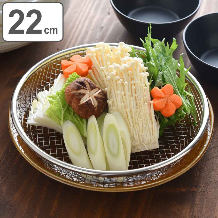 おいしさをそのまま食卓に 22cm新潟県燕三条地域で生産された、ステンレス製の「お皿のための」ザルです。そのまま食卓に出せるように高級感のある仕上げにこだわりました。ご自宅にあるお皿と組み合わせて使うことで、ザルとお皿の間に隙間ができ、熱や湿気が抜けて美味しさと食感をキープします。