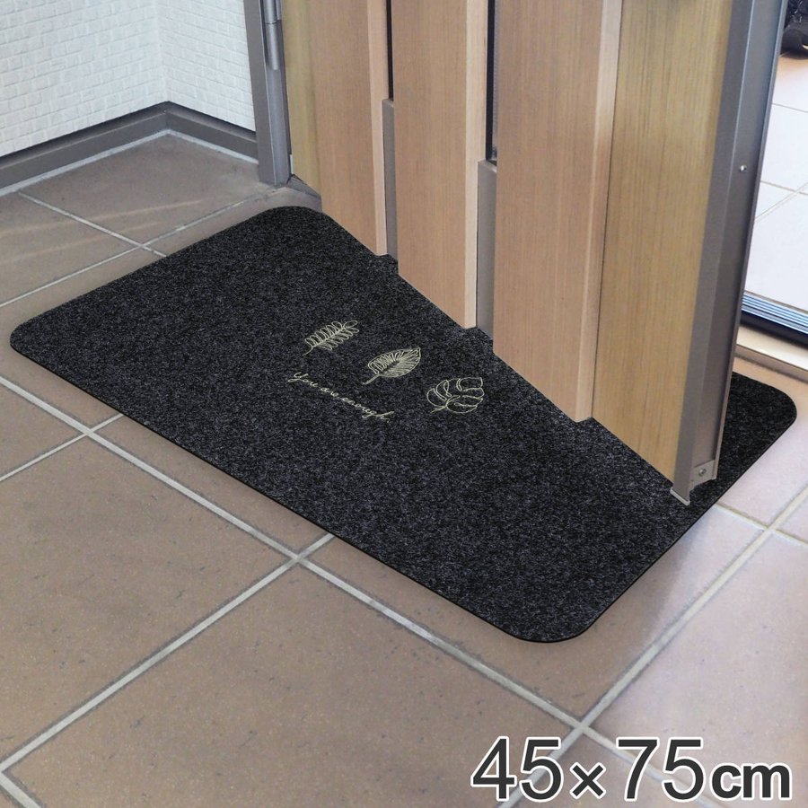 ナチュラルで温かみのある屋内・屋外兼用の玄関マット 45×75cm葉っぱをモチーフにしたナチュラルテイストの玄関マットです。インテリアに馴染むカラーで、おしゃれな雰囲気を演出してくれます。土足を使用する玄関入口外、ドア側・手前(玄関たたき)の屋内・屋外兼用でお使いいただけます。玄関ドアの開閉がスムーズに行える厚みです。