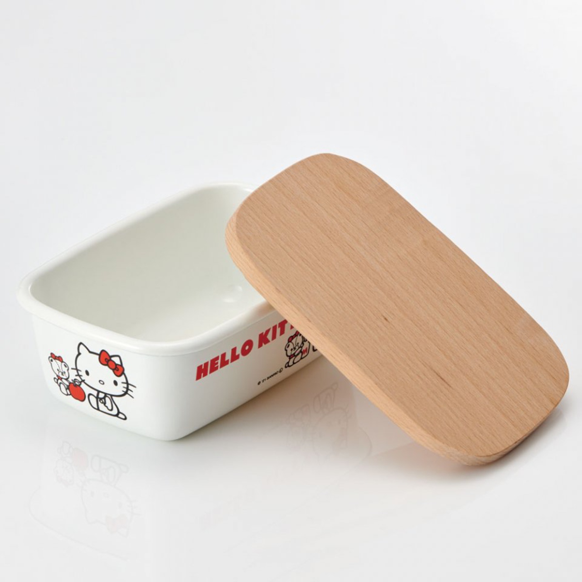 味や香りを変えにくいホーローの色合いとかわいいデザインアルカリ性に強く耐蝕性に優れたホーローと温もりのある木製フタが組み合わさった、キティちゃんのバターケースです。