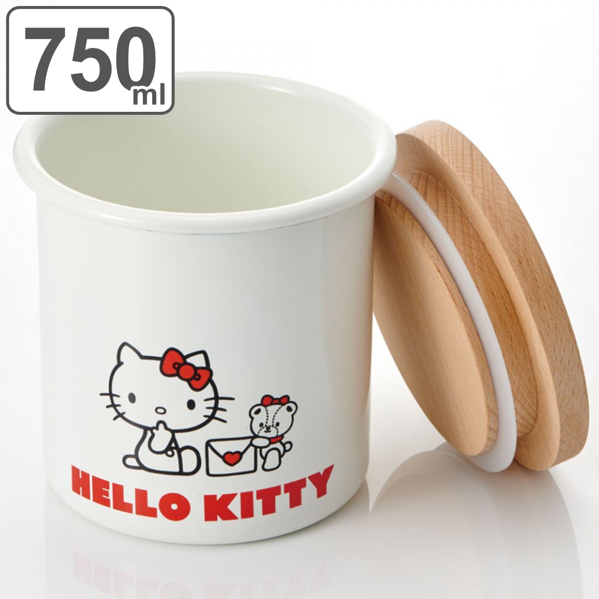 味や香りを変えにくいホーローの色合いとかわいいデザインアルカリ性に強く耐蝕性に優れたホーローと温もりのある木製フタが組み合わさった、キティちゃんのキャニスターです。