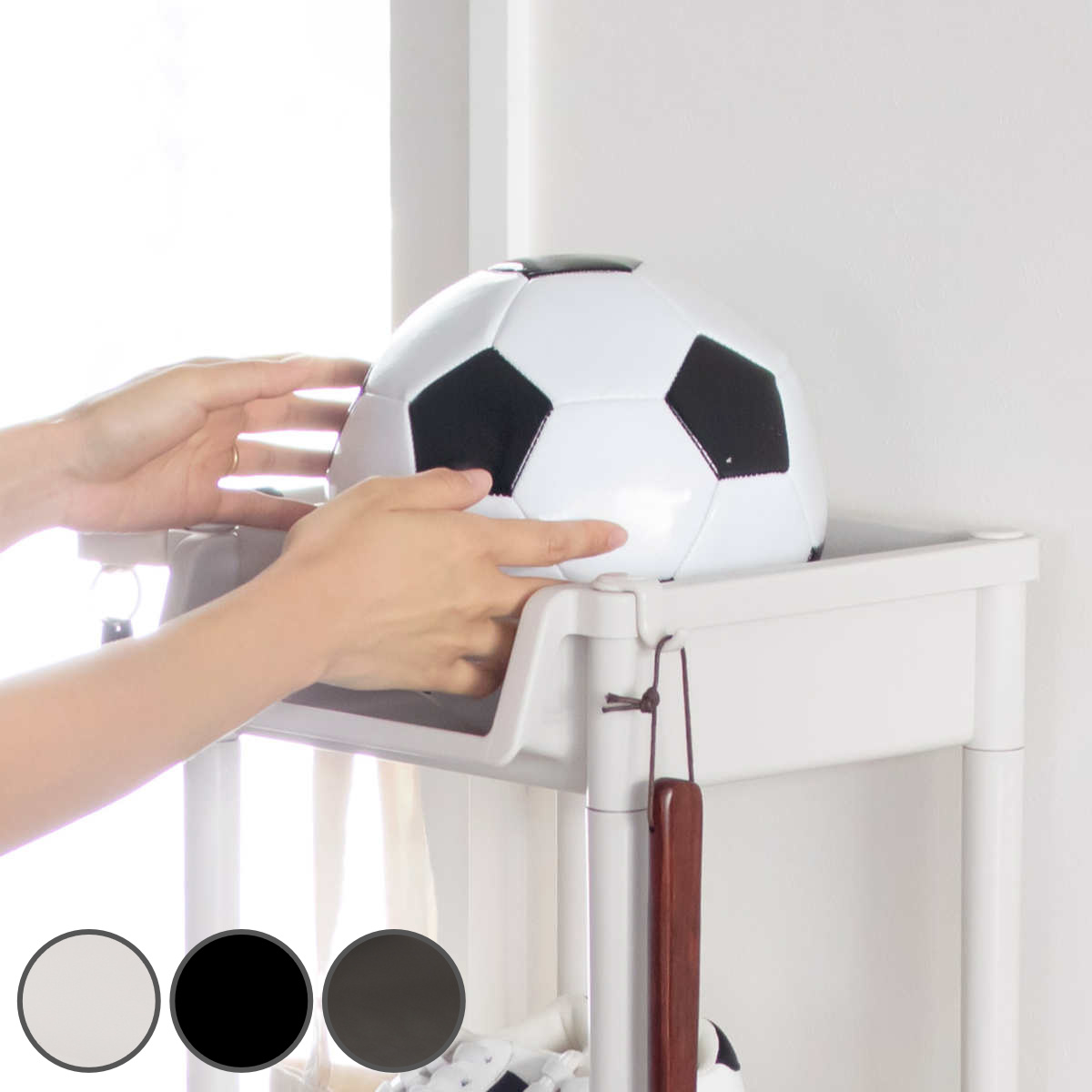 別売りのシューズラックに取り付けられる追加トレーです。置き場所に困りがちなボールやヘルメットをシューズラックと一緒にスッキリと収納することができます。