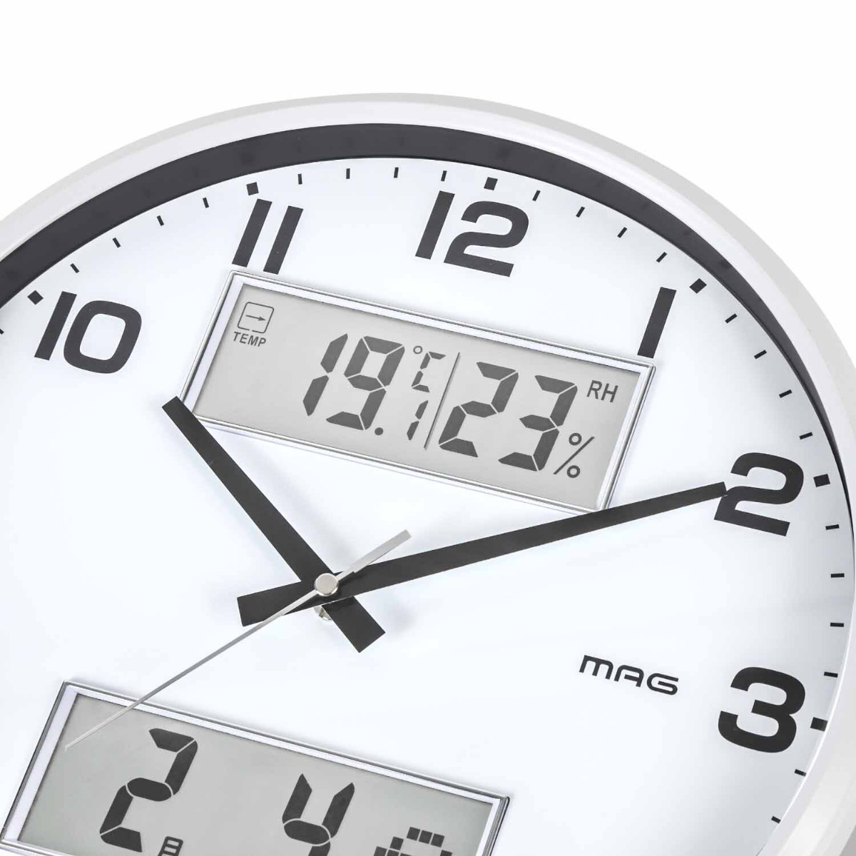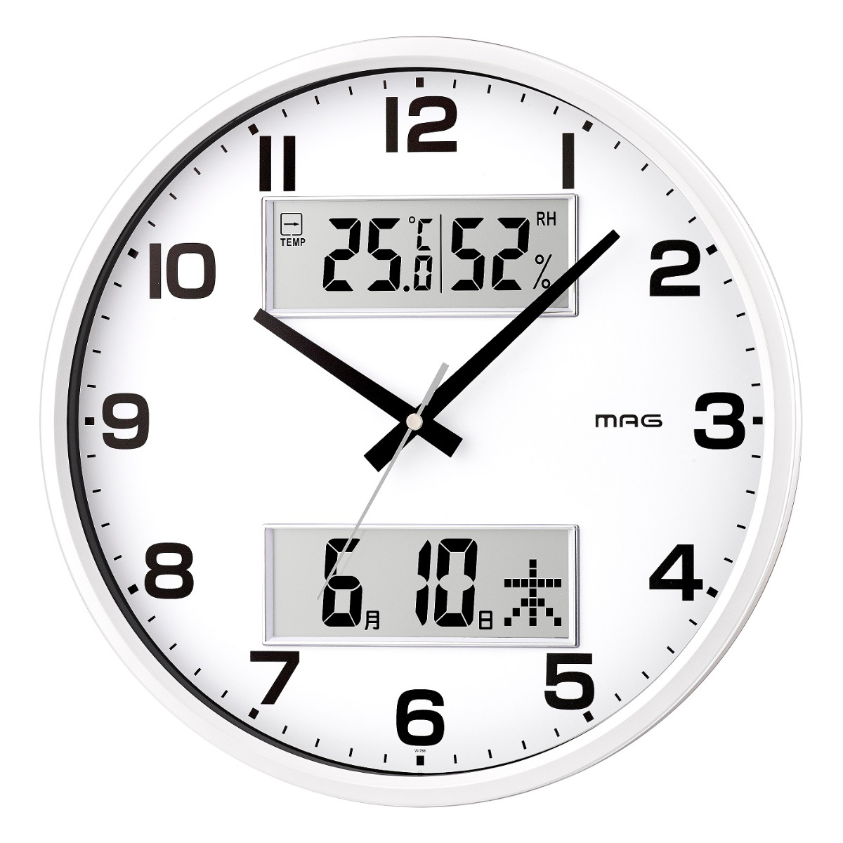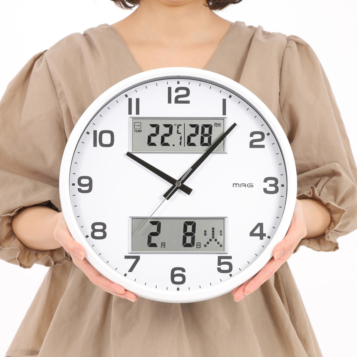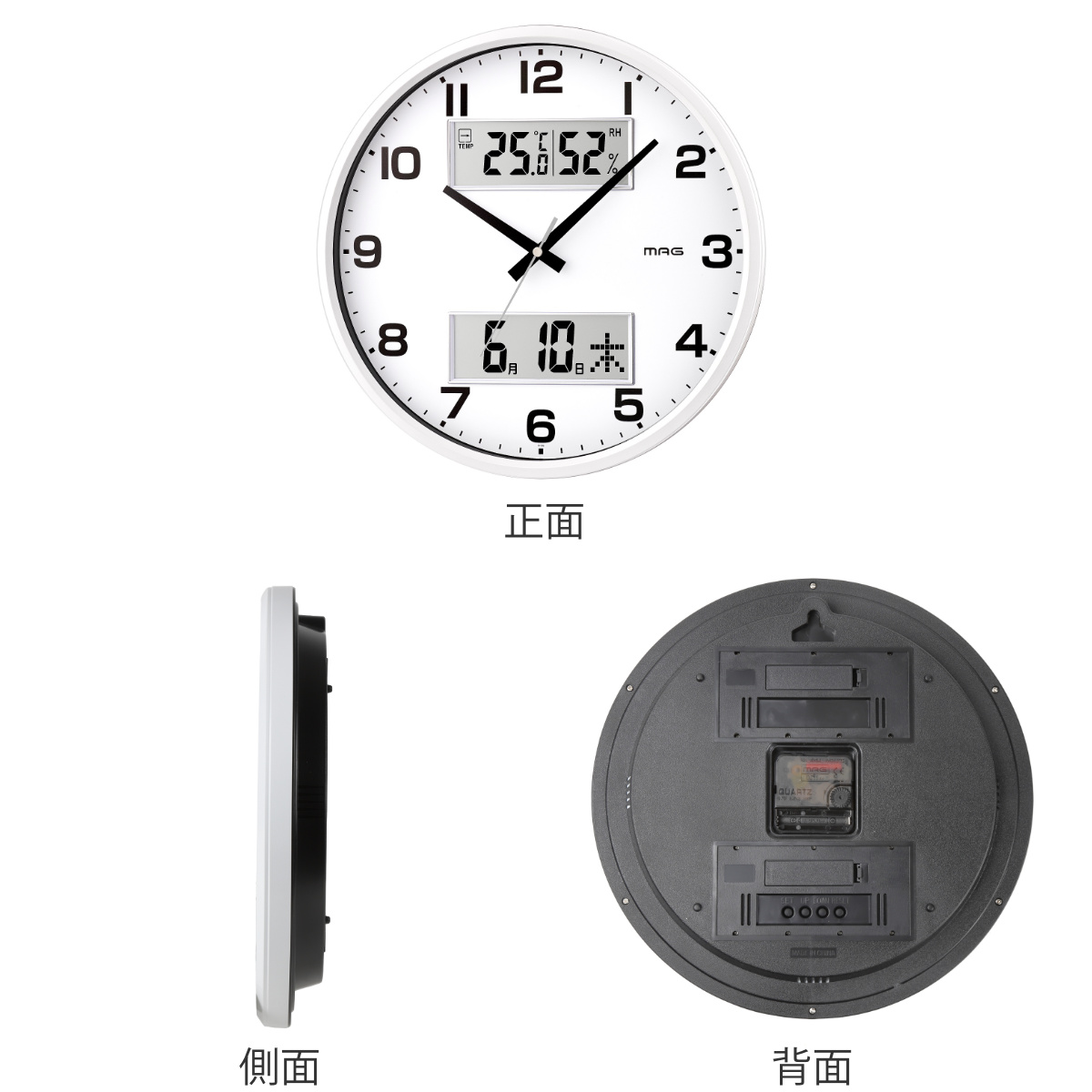 温湿度計表示でお部屋の環境がひと目でわかる掛け時計●日常生活に便利な温度・湿度・カレンダー表示機能付きの掛け時計です。