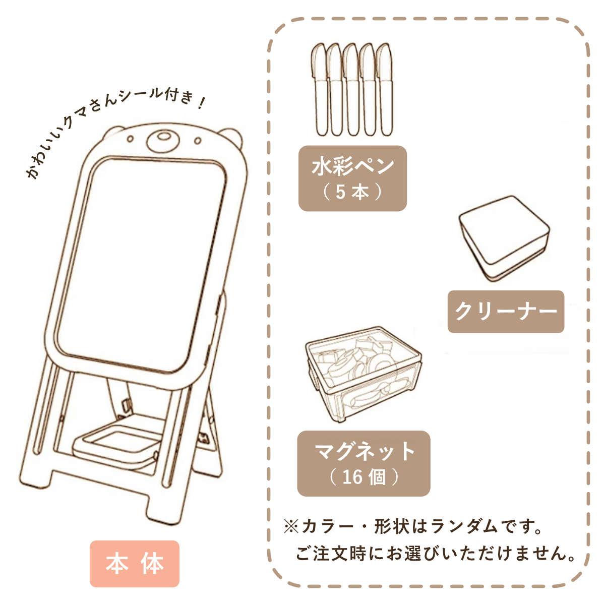 | 内容量 | 1台 付属品:取扱説明書、水彩ペン(5本)、マグネット(16個)、クリーナー、くまさんの耳(2枚)、くまさんの鼻シール(1枚) |