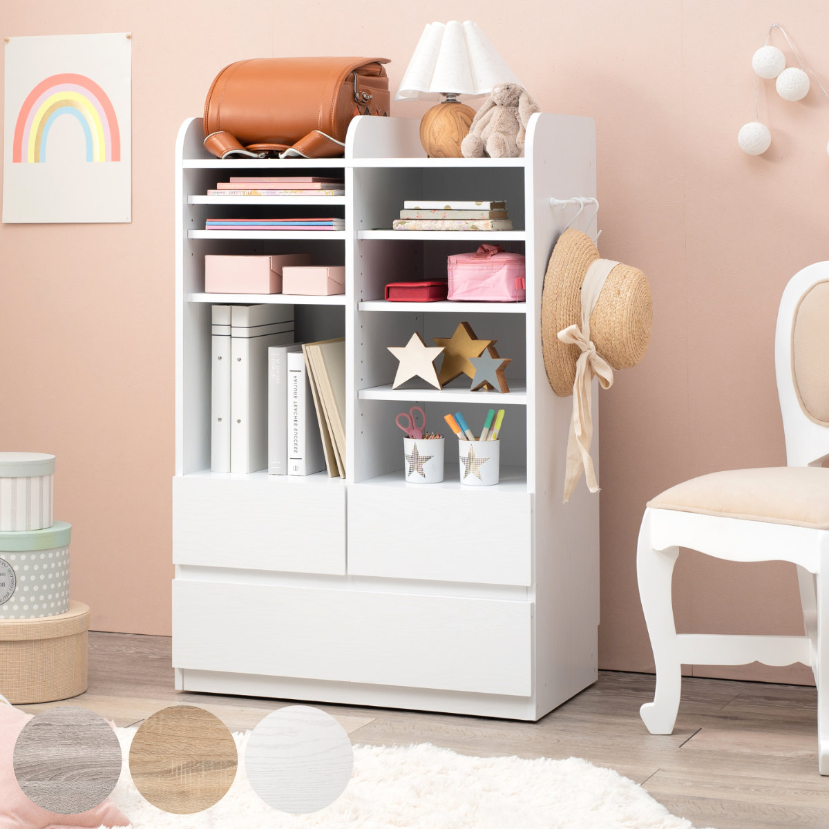 | サイズ | 約 幅68.5×奥行41.5×高さ107(cm) サイドフック含む幅:約71.5(cm) 引き出し(小)有効内寸:約 幅26.5×奥行33.5×高さ7.5(cm) 引き出し(大)有効内寸:約 幅60×奥行33.5×高さ7.5(cm) |