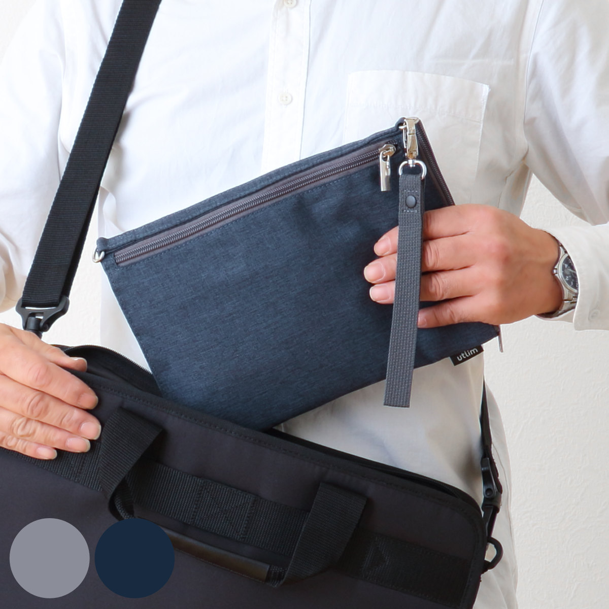 ショルダーベルトをストラップに付け替えれば、クラッチバッグに変身します。インナーバッグとしても使用でき、1つあれば複数の用途に対応できます。