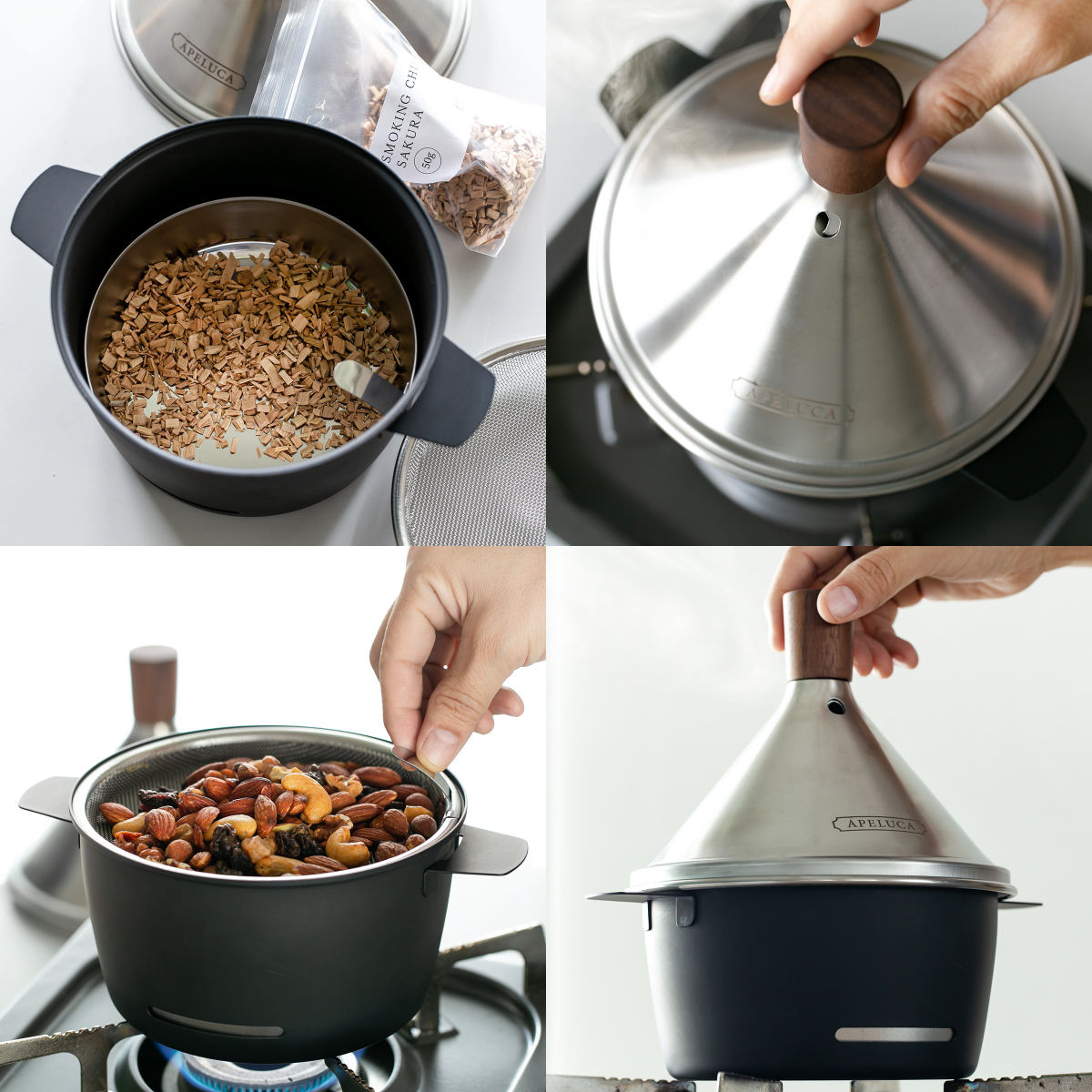 テーブルの上で簡単・手軽に燻製をカジュアルなもてなしのテーブルに置きたい小さな燻製器です。小さな食材から気軽にトライできるのが魅力です。出来上がるまでの間、蓋の穴からフワリと流れる煙を見ながら、香りだけでなくのんびりしたムードまで楽しめます。